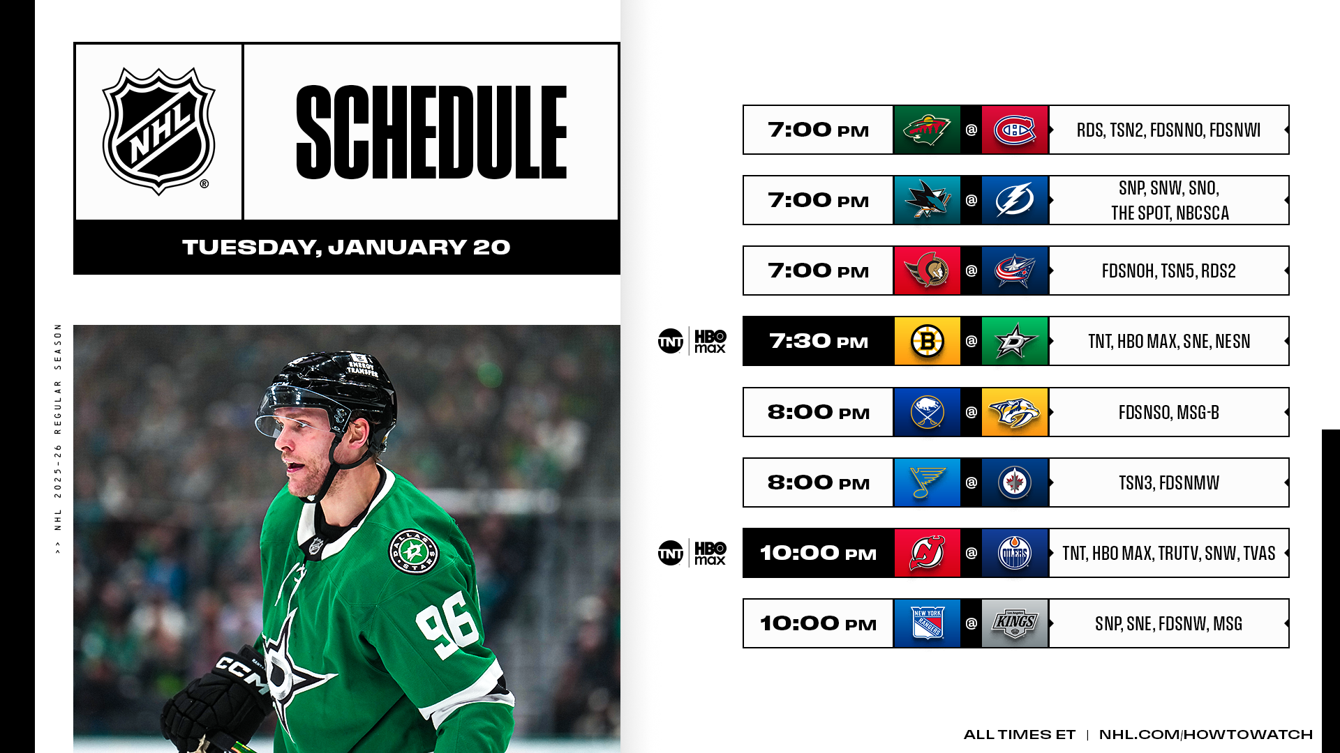 * Tuesday’s eight-game schedule features a second straight NHL on TNT doubleheader opening with the Bruins visiting the Stars followed by the Oilers hosting the Devils.