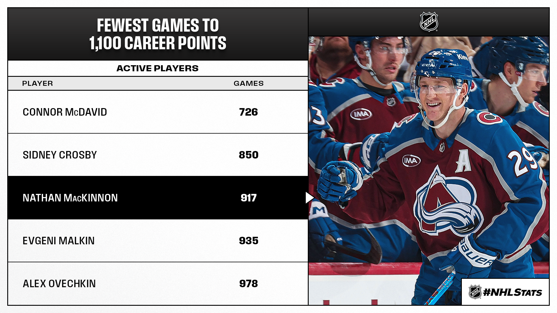 Nathan MacKinnon reached the 1,100-point mark and Sidney Crosby collected multiple points in his 1,400th career game as the two Olympic-bound stars lifted their respective clubs to victory during the Monday slate.