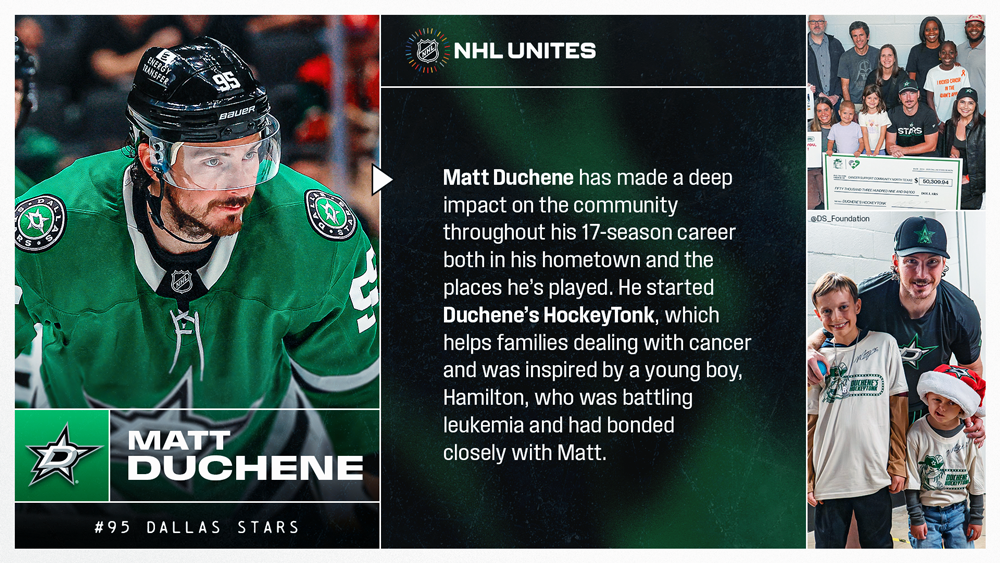 * Matt Duchene, who became the second person from the 2009 NHL Draft class to reach the 900-point milestone earlier this month, is being featured for the meaningful work he does in the community ahead of the Stars taking center stage on TNT. Duchene has been instrumental in making the lives of people with cancer brighter – he welcomes kids going through cancer treatment to Stars games, along with their siblings and families, and meets them after. Duchene once again donated a suite this season, an in-kind commitment totaling nearly $200,000 since joining Dallas in 2023-24. In October, Cancer Support Community North Texas was granted a check from Duchene’s HockeyTonk for $50,309.94.