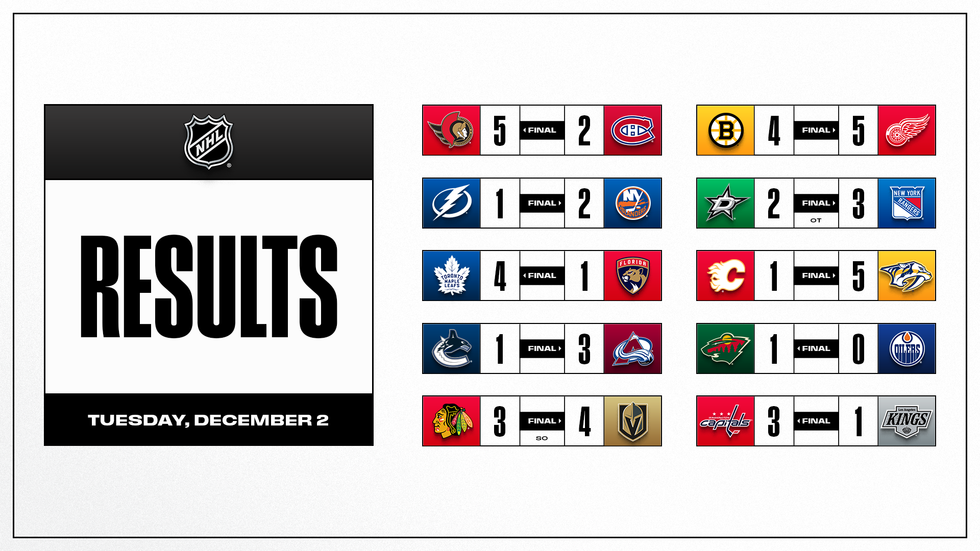 Brady Tkachuk (1-1—2) and Patrick Kane (0-2—2) each posted multi-point performances as the second-place Senators (13-9-4, 30 points) and third-place Red Wings (14-11-2, 30 points) both scored five times to climb the Atlantic Division standings thanks to victories against the Canadiens and Bruins, respectively.