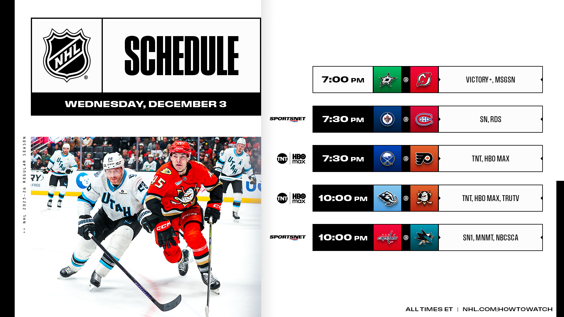 Wednesday’s five-game slate includes an NHL on TNT doubleheader that features four clubs who missed the playoffs last season but are in the mix in 2025-26 continuing their pursuits when Buffalo battles Philadelphia and Utah visits Pacific Division-leading Anaheim. Sportsnet programming in Canada will also feature Montreal hosting Winnipeg before Washington faces San Jose.