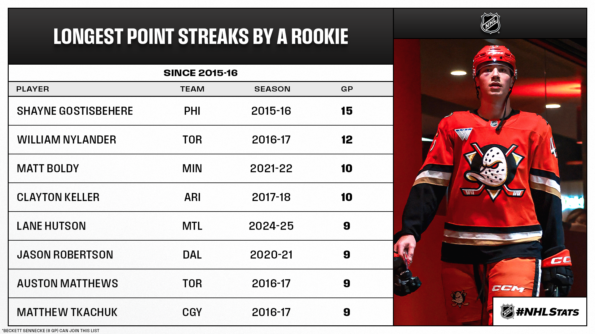 * The Ducks have garnered a lot of their success through the play of their young skaters, including rookie Beckett Sennecke (7-13—20). The 19-year-old has contributed 20 of Anaheim’s League-leading 89 points by players age 21 or younger this season, seven spots above the Mammoth (24). Sennecke has accumulated eight of his rookie-pacing point total this season during his active eight-game point streak and can pass Paul Kariya (8 GP in 1994-95) for the longest run by a rookie in franchise history.