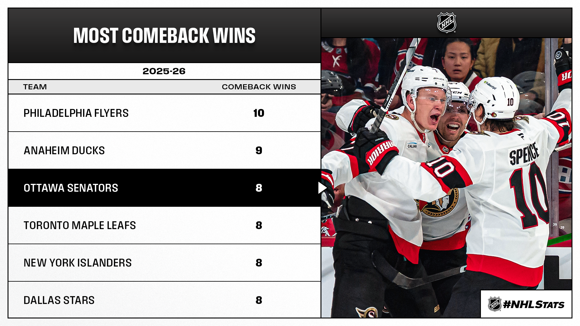 * Tkachuk, who assisted on one of four straight Senators goals, later scored his first goal of the season to lift his club to their eighth comeback win of the season – tied for the third most among all teams. Tkachuk boosted his career totals to 192-218—410 (518 GP); he tied Wade Redden (410) for fifth place on the franchise’s all-time points list and passed Chris Phillips (217) for ninth on the club’s all-time assist list.