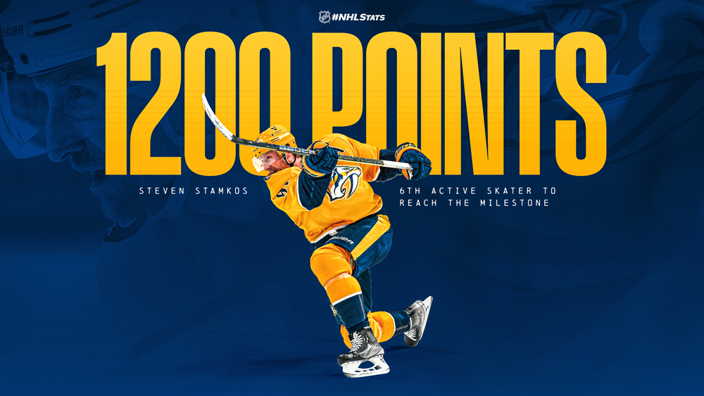 Milestones were defined by “1,200” on Tuesday night as Jamie Benn and David Perron each reached games played milestones while Predators forward Steven Stamkos (589-611—1,200) scored and collected his 1,200th career point.