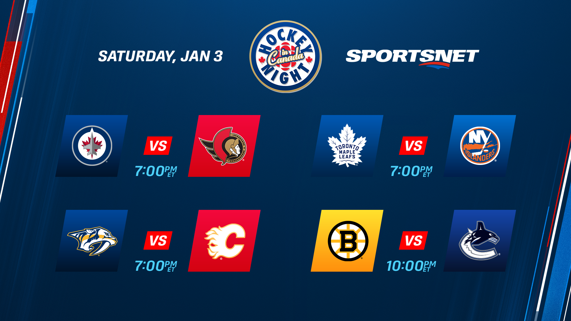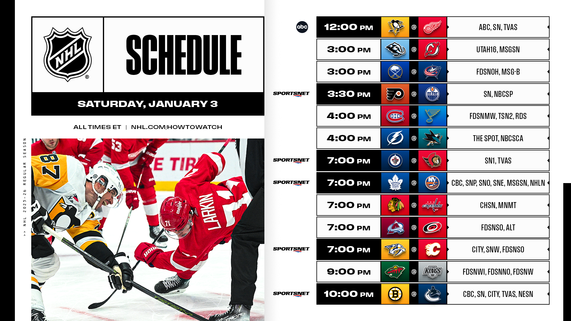 * The action continues in mere hours with the first ABC Hockey Saturday as Sidney Crosby and the Penguins visit Dylan Larkin and the Red Wings for their second meeting since the calendar turned. Hockey Night in Canada will open with an Auston Matthews–Matthew Schaefer showdown and close in Vancouver, where the 2025-26 regular season will reach the exact halfway mark.