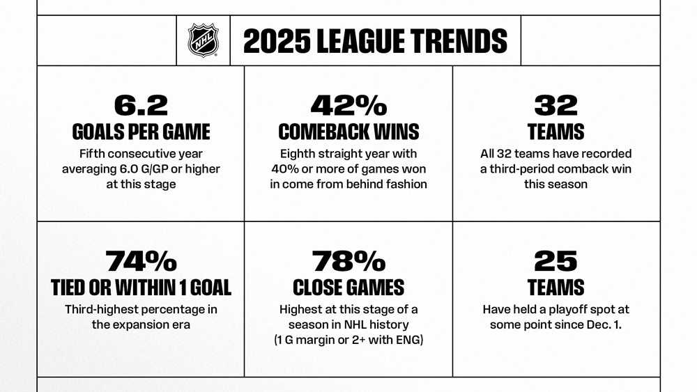 * The #NHLStats Pack: Halfway Mark of the 2025-26 Season dials into the top trends so far, with games closer than ever before (an all-time high 78% of contests are close games) and 25 of 32 clubs having held a playoff spot at some point since Dec. 1.