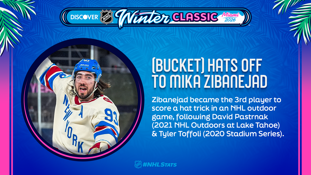 * Zibanejad netted the first Winter Classic hat trick and set an outdoor record with five points – hours after being named to Team Sweden – in front of a sold-out crowd of 36,153 in Miami. That brought the total attendance at NHL outdoor games to 2,276,221 and marked the 17th sellout in as many Winter Classic contests.