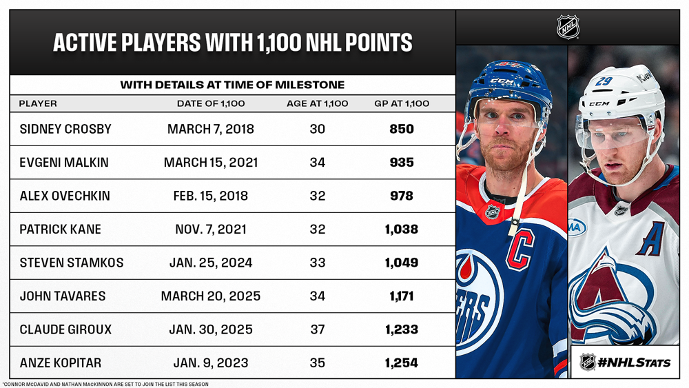 5. Avalanche at Oilers on Sportsnet and TVA Sports (Saturday): Connor McDavid enters the week needing one point to reach 1,100 in his career and is set to play two contests before concluding a four-game Hockey Night in Canada against soon-to-be Team Canada teammate Nathan MacKinnon. McDavid is set to become the fourth-fastest player in NHL history to hit the milestone behind Wayne Gretzky (464 GP), Mario Lemieux (550 GP) and Mike Bossy (725 GP) – slotting in ahead of current fourth-place holder Peter Stastny (793 GP). MacKinnon also is on pace to hit the milestone in 2025-26 (currently projected to hit in 940 GP).