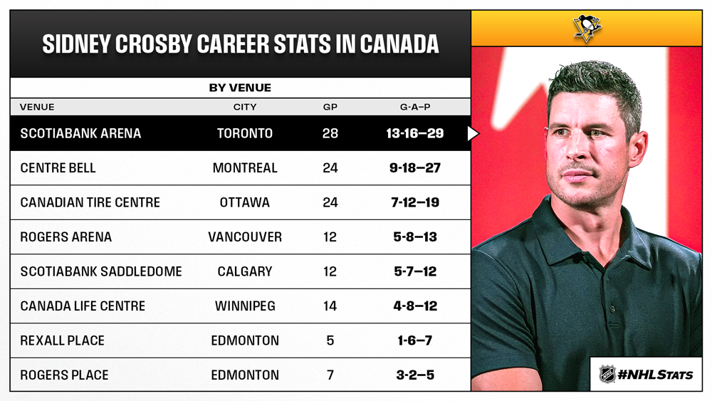 * Crosby has tallied 306 of his 1,703 career points against Canadian teams, including 30-43—73 against the Maple Leafs (56 GP; 1.30 P/GP) – his highest goal and point totals against clubs from his home country. The only Canadian team he has more assists against is Montreal (25-44—69 in 52 GP; 1.33 P/GP). While Crosby is averaging more than point-per-game in Toronto during his career, it has been nearly seven years since his last goal at Scotiabank Arena (Feb. 2, 2019).