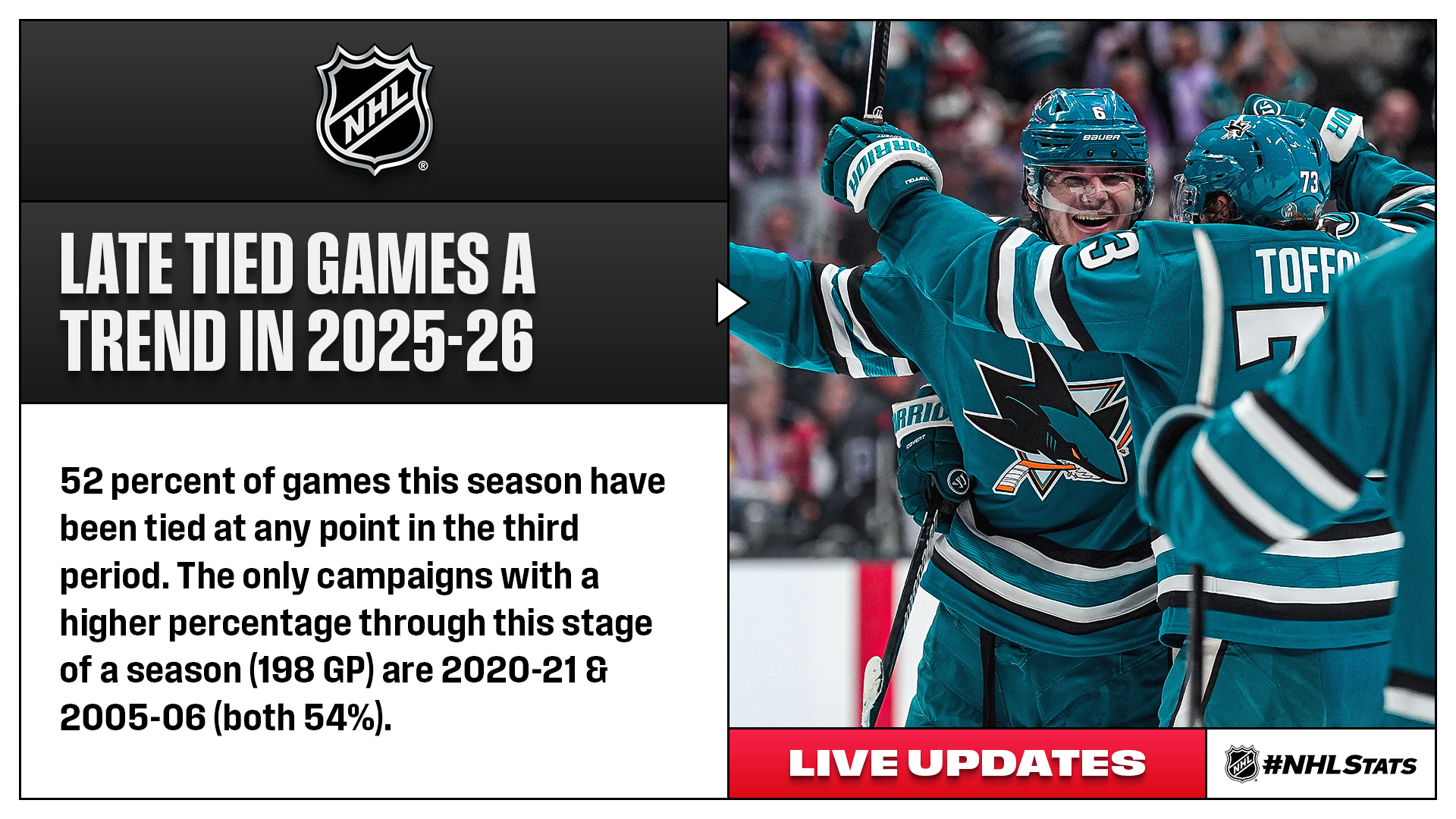 * The League-wide trend of close games continued Sunday, with three of five contests tied at any point in the third period. Overall, 52 percent of games this season have featured an even score at some point in the final frame.