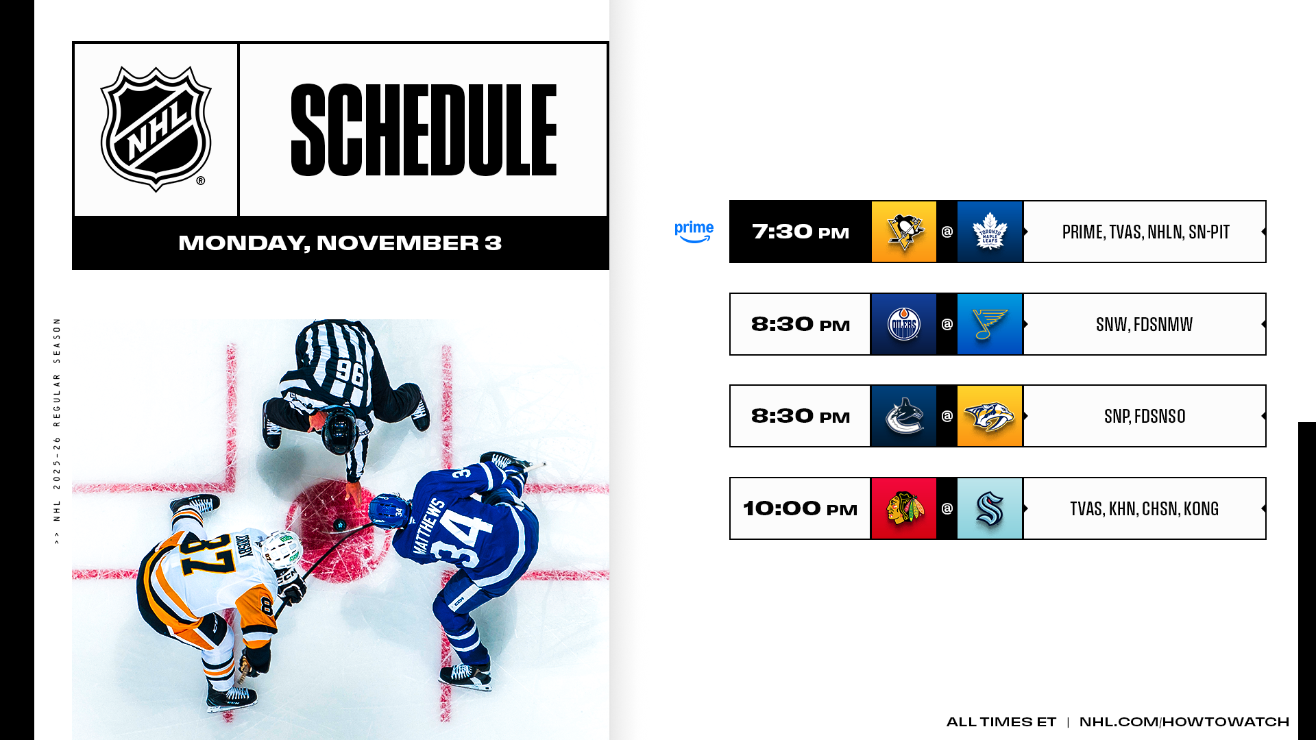 Monday’s slate begins on Prime Monday Night Hockey when Sidney Crosby and the Penguins visit Auston Matthews and the Maple Leafs.