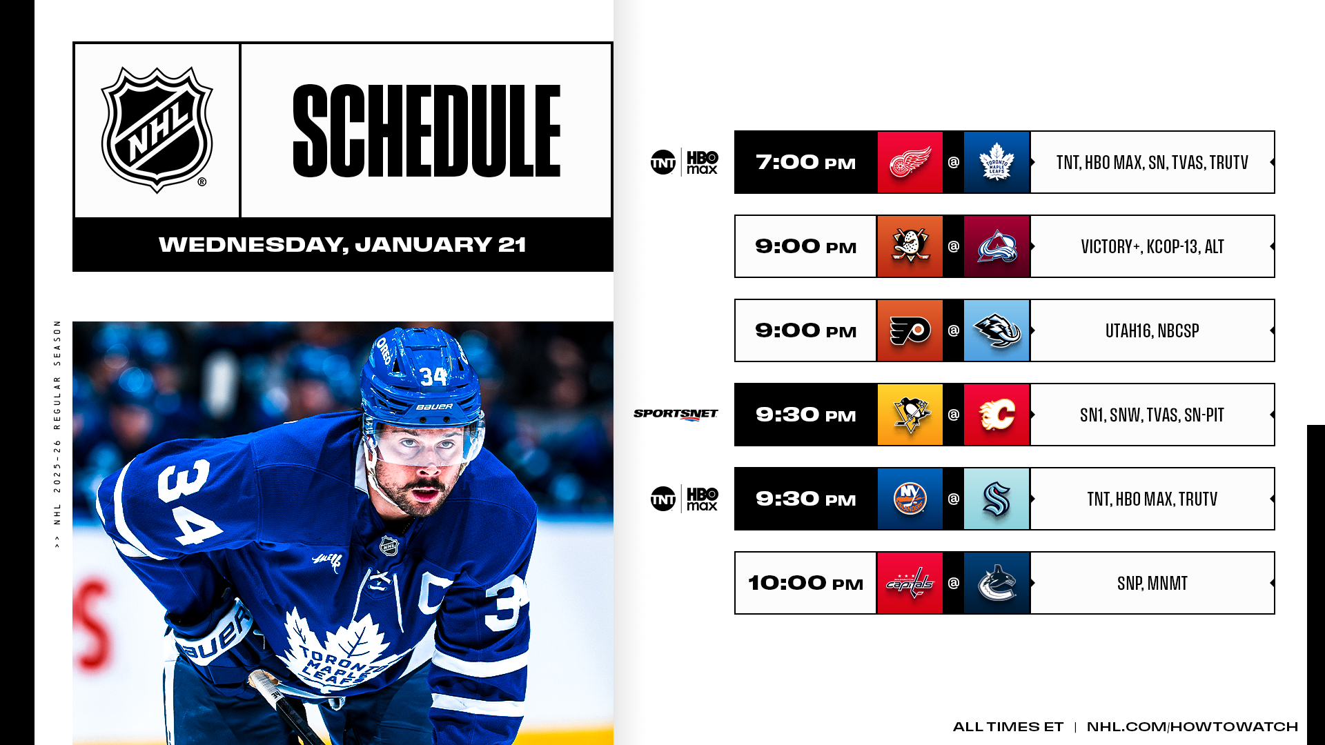 A six-game slate opens with an Original Six showdown between the Maple Leafs and Red Wings broadcast nationally in the U.S. (TNT, HBO Max, truTV) and Canada (Sportsnet, TVA Sports) before the Islanders and Kraken take over the second half of a doubleheader on TNT.