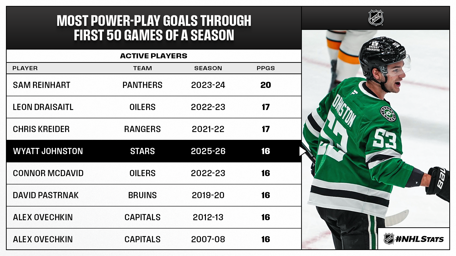 * Johnston found the score sheet with his NHL-leading 16th power-play goal this season and surpassed Brett Hull (15 in 1998-99) for the third most in a single season in Stars team history, behind Mike Modano (18 in 1993-94) and Jamie Benn (17 in 2015-16).