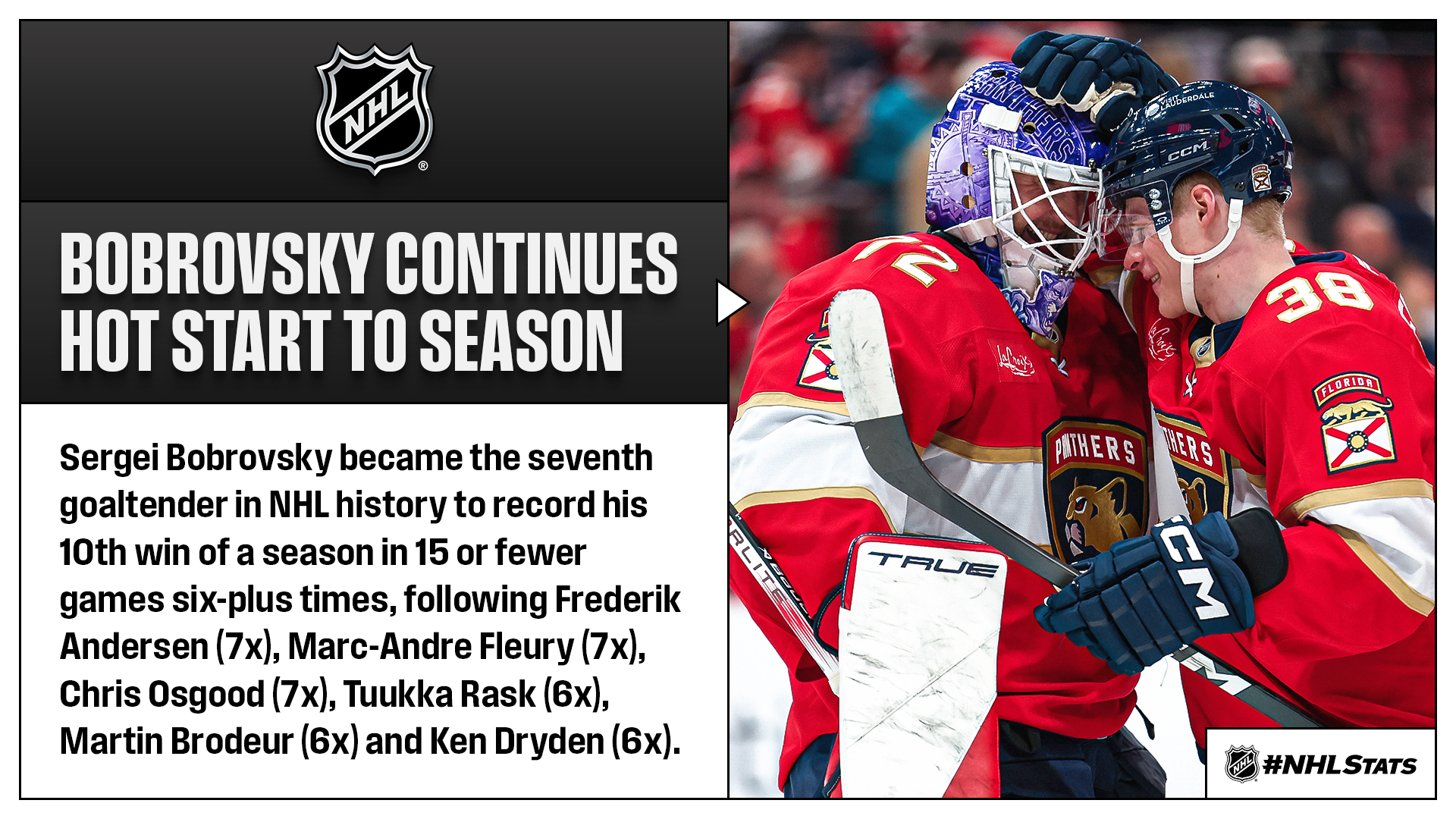 * Sergei Bobrovsky turned aside all 31 shots he faced and became the third goaltender to reach a double-digit win total this season as the Panthers skated to victory at Amerant Bank Arena. Bobrovsky tied Tomas Vokoun (51) for the seventh-most shutouts by a goaltender born outside of North America behind Dominik Hasek (81), Henrik Lundqvist (64), Pekka Rinne (60), Evgeni Nabokov (59), Jaroslav Halak (53) and Tuukka Rask (52).