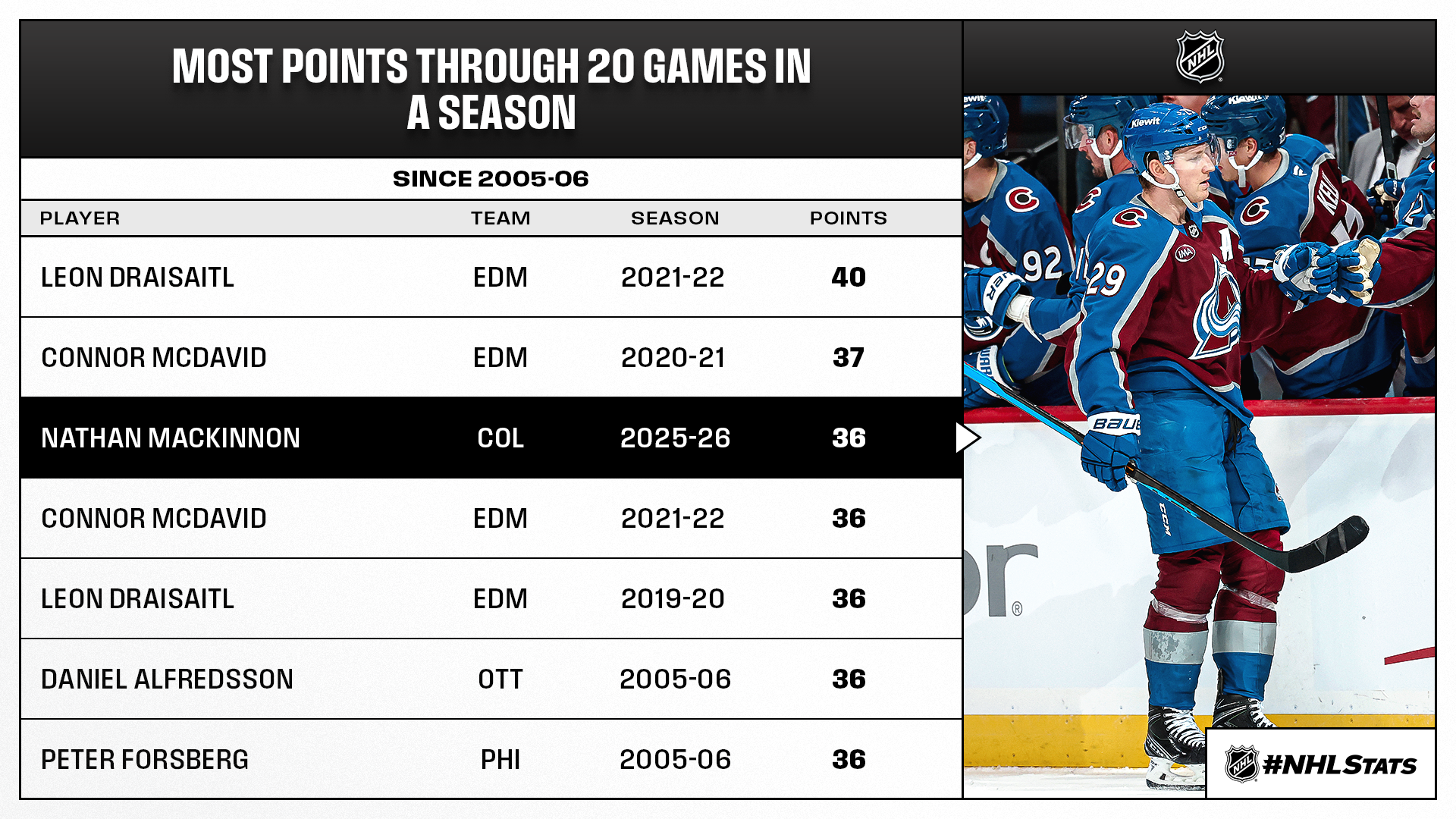 * MacKinnon (2-1—3) factored on three of his team’s six tallies to bolster his lead in the 2025-26 goals and points race (16-20—36 in 20 GP) as the Avalanche defeated the Rangers to extend their win streak to seven games. MacKinnon, who boosted his career totals to 383-668—1,051 (890 GP) and surpassed Peter Stastny (380-668—1,048 in 737 GP) for the second-most points in Avalanche/Nordiques history, became the fifth Canadian player in the past decade to score 16 goals through 20 games in a season. The others: Brayden Point (16 in 2024-25), Bo Horvat (16 in 2022-23), Connor McDavid (16 in 2022-23) and Sidney Crosby (17 in 2016-17). Point, McDavid and Crosby have been named to Team Canada alongside MacKinnon.
