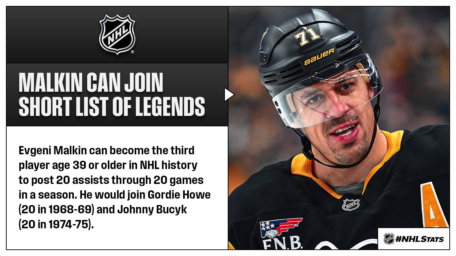 * Crosby (12-9—21 in 19 GP) can become the sixth active player to score 13-plus goals through 20 games in a season at least four times (2023-24, 2016-17 & 2010-11) and would join Alex Ovechkin (10x), David Pastrnak (6x), Leon Draisaitl (4x), Auston Matthews (4x) and Steven Stamkos (4x). Meanwhile, Malkin (5-18—23 in 19 GP) can become the fourth player this season to hit 20 assists and could also end up as the fourth player age 39 or older in NHL history to have at least 25 points through the 20-game mark of a campaign, following Gordie Howe (31 in 1968-69), Ovechkin (27 in 2024-25) and Jean Ratelle (26 in 1979-80).