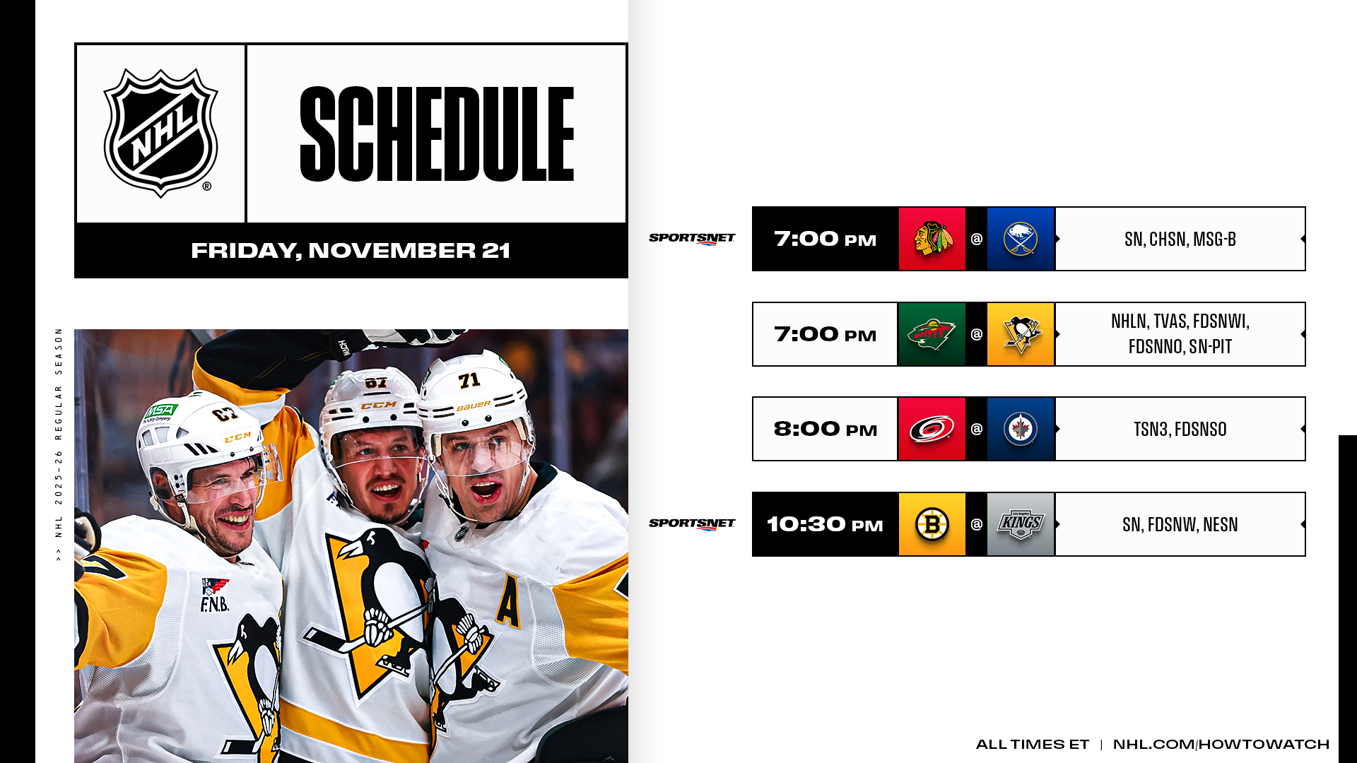 A four-game Friday will feature a doubleheader on Sportsnet, Nikolaj Ehlers’ return to Winnipeg as well as the Penguins on NHL Network in their first game back in North America since skating at the 2025 NHL Global Series Sweden.