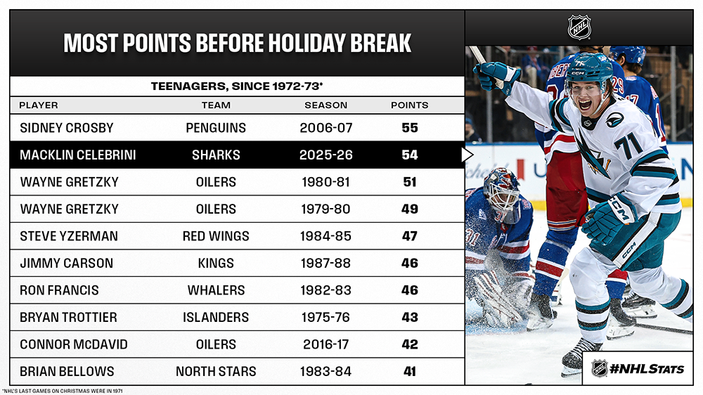 * McDavid (1-2—3) factored on three goals and moved into first place in the League scoring race, eclipsing MacKinnon, as the Oilers (18-13-6, 42 points) fended off a Golden Knights (16-8-10, 42 points) rally to gain ground on them in the Pacific Division standings. McDavid boosted his 2025 totals to 41-100—141 (including playoffs), marking his fifth career 140-point season – tied with Mario Lemieux and Phil Esposito for the second most in NHL history behind Wayne Gretzky (13). For more on the teams and players that have led the way since the turn of the calendar, check out the 2025 Year in Review by #NHLStats.