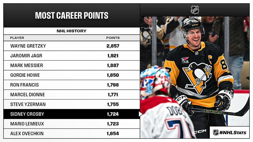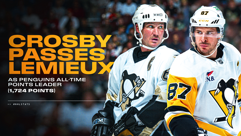 Sidney Crosby collected Pittsburgh’s first goal and assisted on the Penguins’ second to reach 1,724 career points and pass Mario Lemieux (1,723) as the franchise’s all-time scoring leader, a title Lemieux had held for nearly 37 years. Crosby also leapfrogged Lemieux for eighth place on the NHL’s all-time points list and for the third most with one franchise in League history.