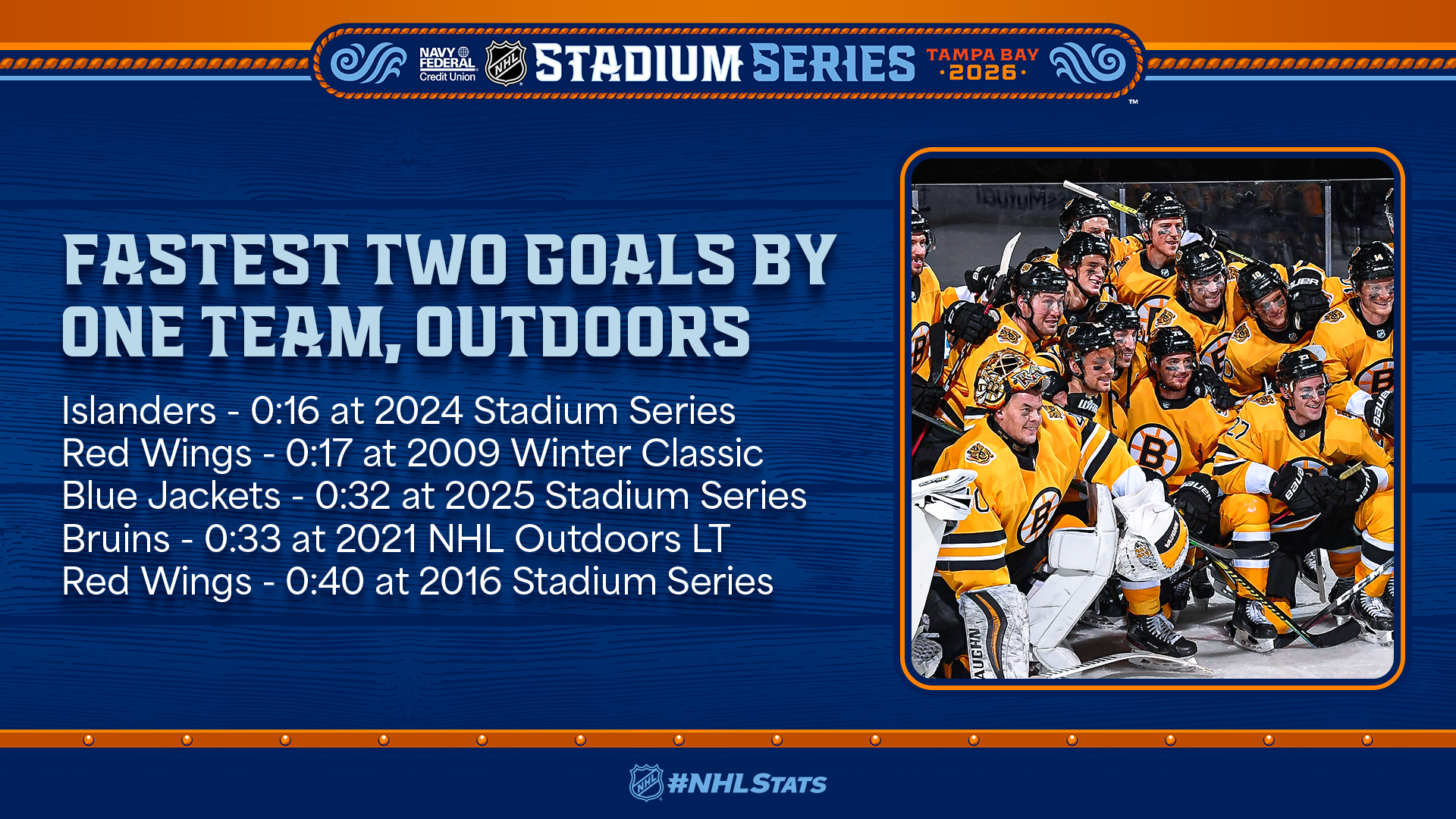 * The Bruins have four games remaining before meeting the Lightning at Raymond James Stadium for the 2026 Navy Federal Credit Union NHL Stadium Series. Boston (4-1-0), set to tie the second-most outdoor games played by one franchise, is no stranger to scoring in quick succession in outdoor games as well and owns the fourth-fastest two goals in that scenario (0:33 at 2021 LT).