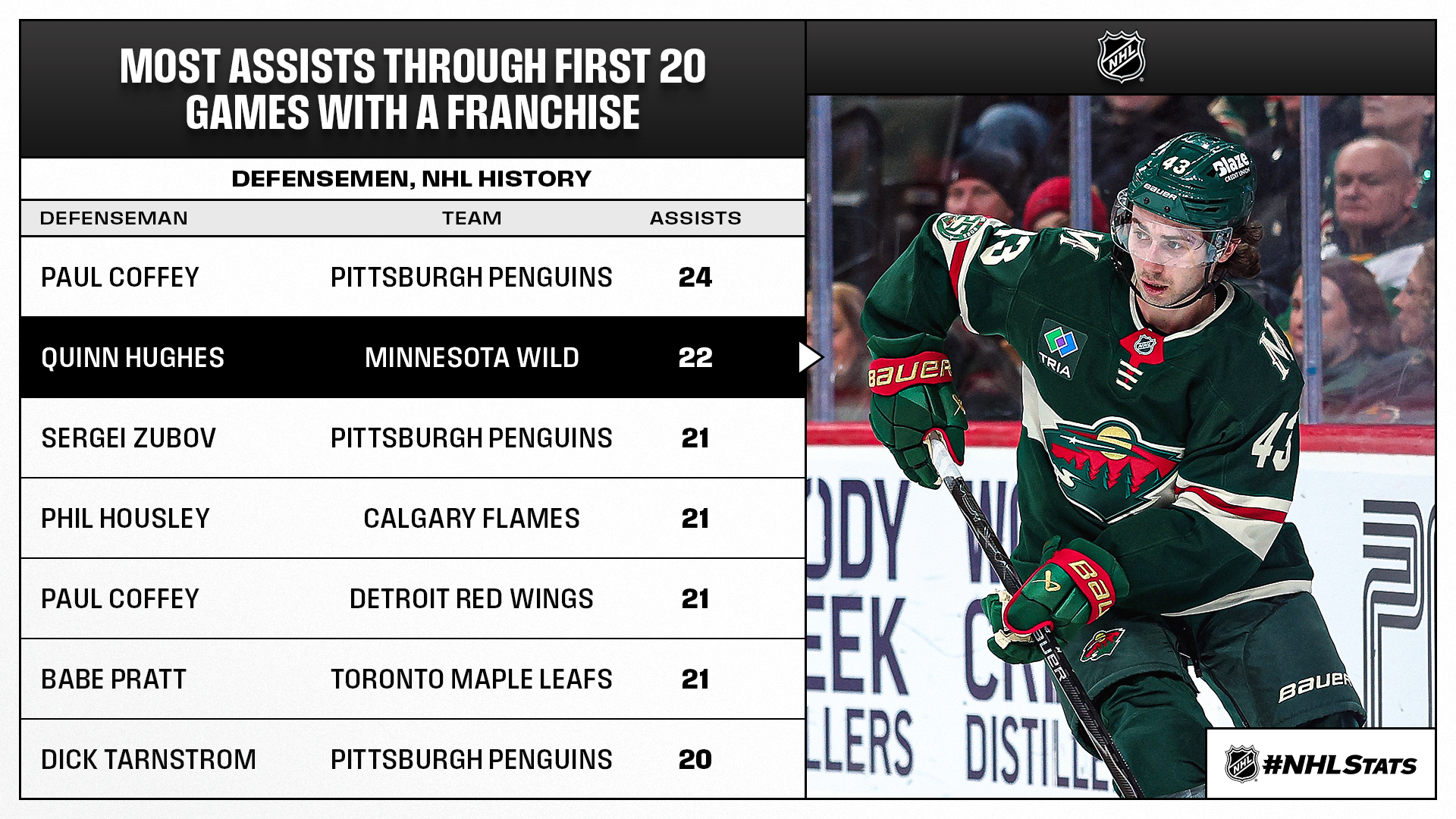 * Quinn Hughes factored on the overtime goal to cap his fourth three-assist night since joining the Wild and recorded the second-most assists by a defenseman in NHL history through 20 games with a franchise.