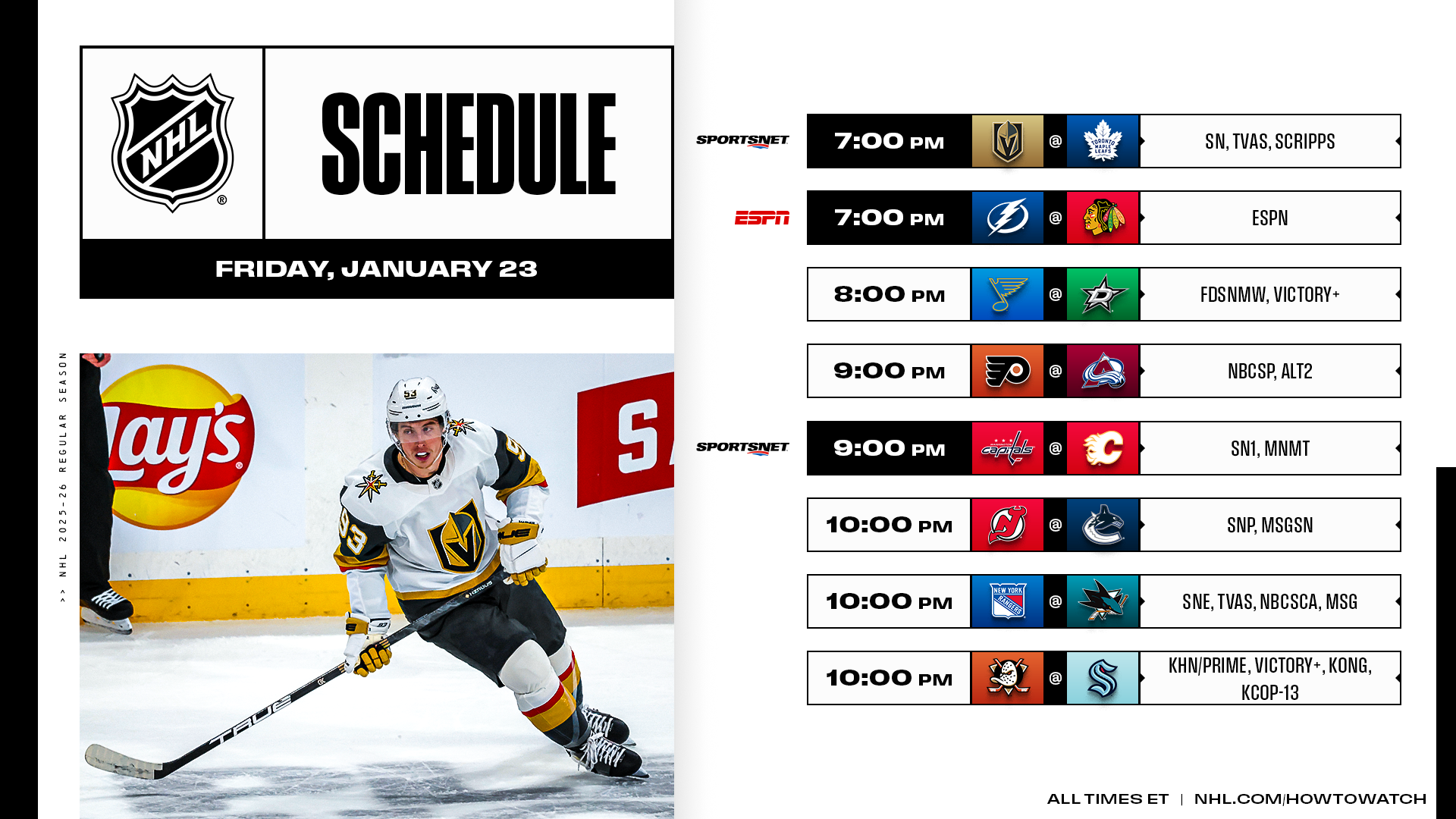 Friday’s eight-game slate will see Mitch Marner play at Scotiabank Arena as a visitor for the first time when the Golden Knights visit the Maple Leafs on Sportsnet and TVA Sports. South of the border, the Blackhawks host the streaking Lightning on ESPN – with Tampa Bay having only four more games before they host an outdoor contest for the first time (Feb. 1 vs. BOS, also on ESPN).