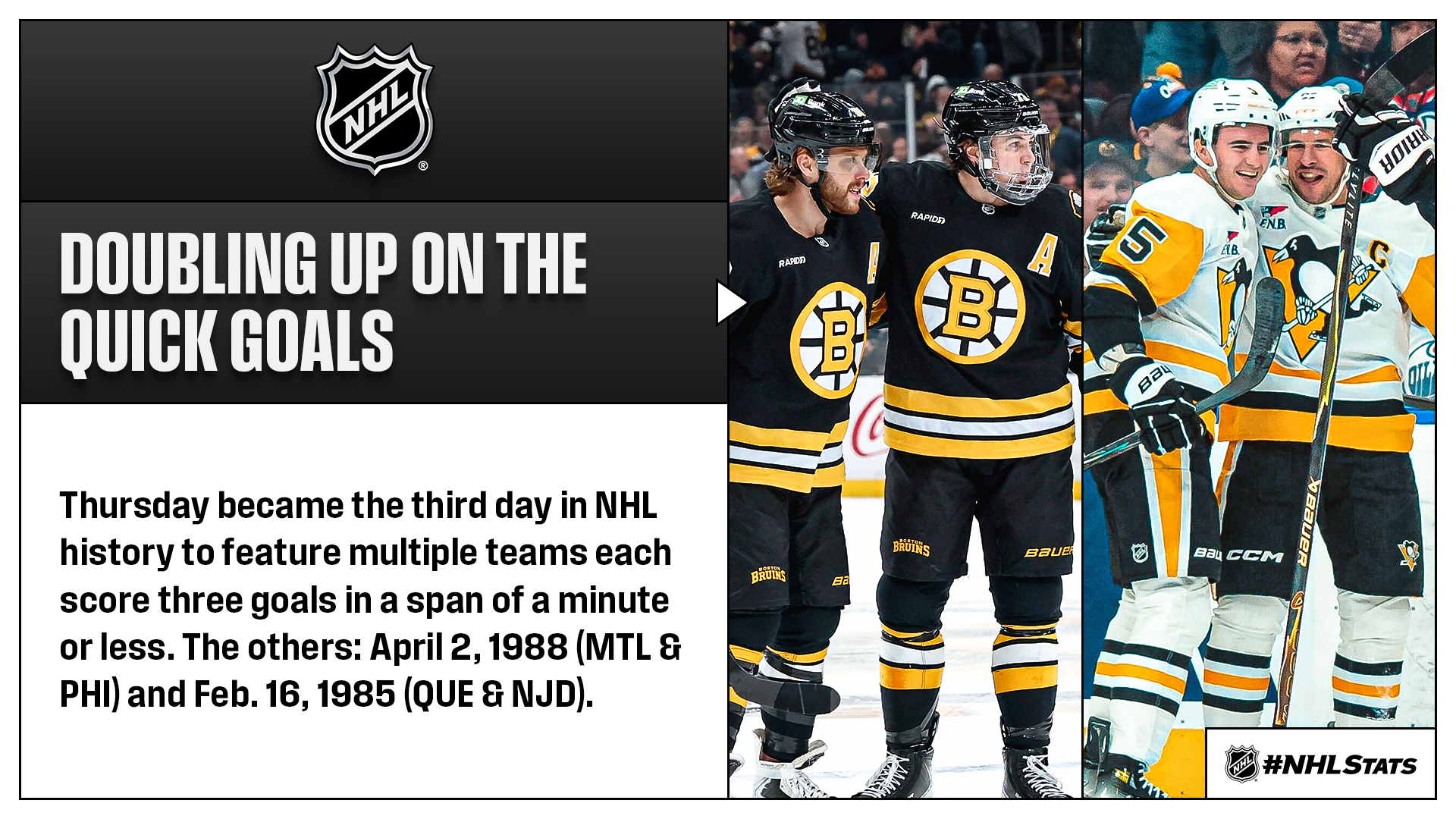 PENGUINS AND BRUINS COMBINE FOR RARE FEAT WITH QUICK GOALS