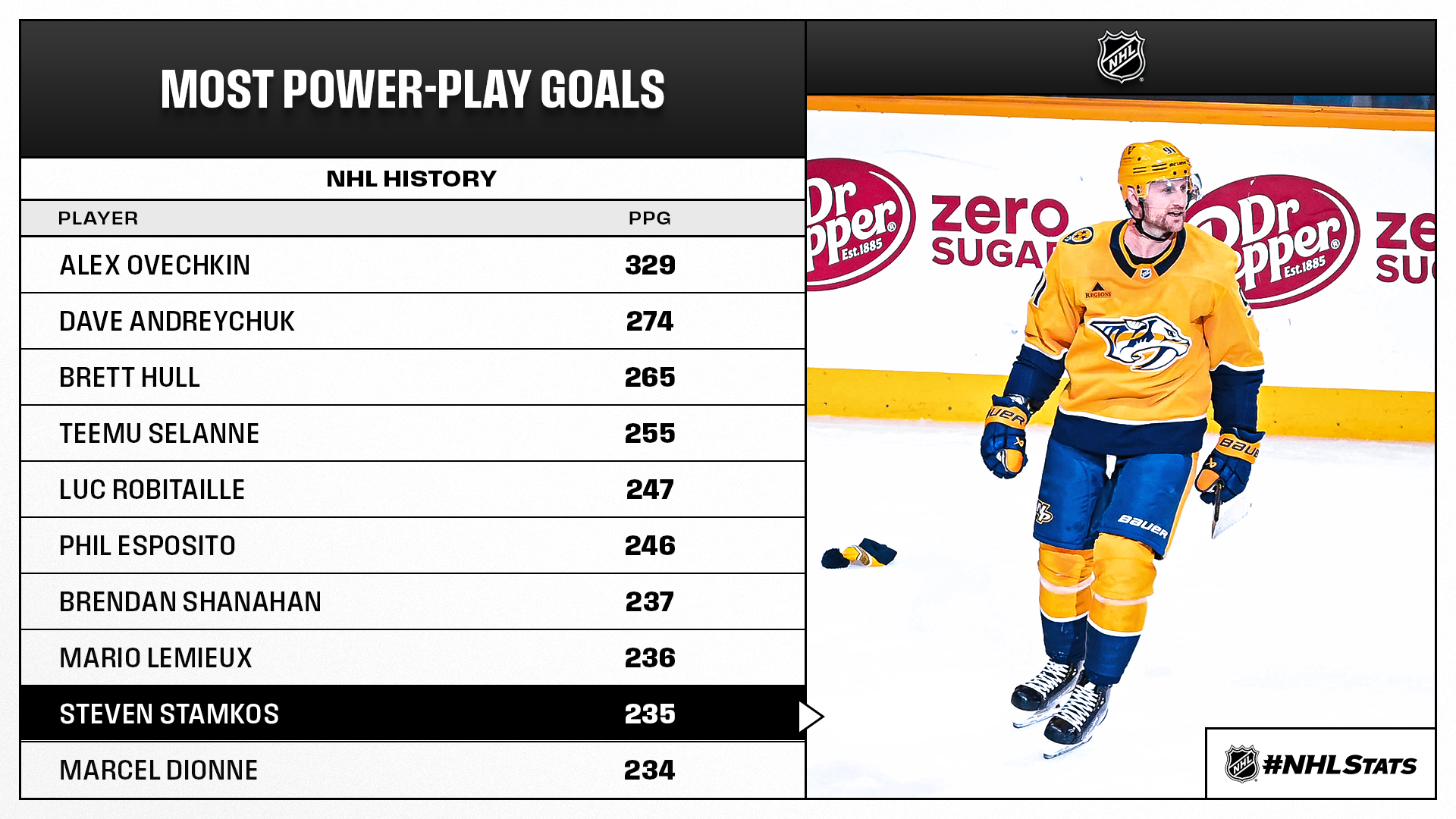 Steven Stamkos scored two of his three goals on the power play to register his 16th career hat trick, climb an NHL all-time list and propel the Predators to their first three-goal comeback win of the season.