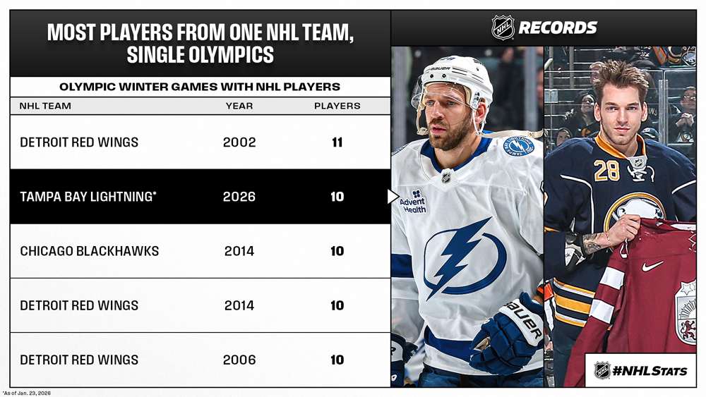 * Did You Know? The youngest player named to a 2026 Olympic roster is Team Latvia defenseman Alberts Smits, while the oldest is former Lightning forward Pierre-Edouard Bellemare (Team France). The #NHLStats Pack for the Olympics contains details on this, plus charts for all categories mentioned above.
