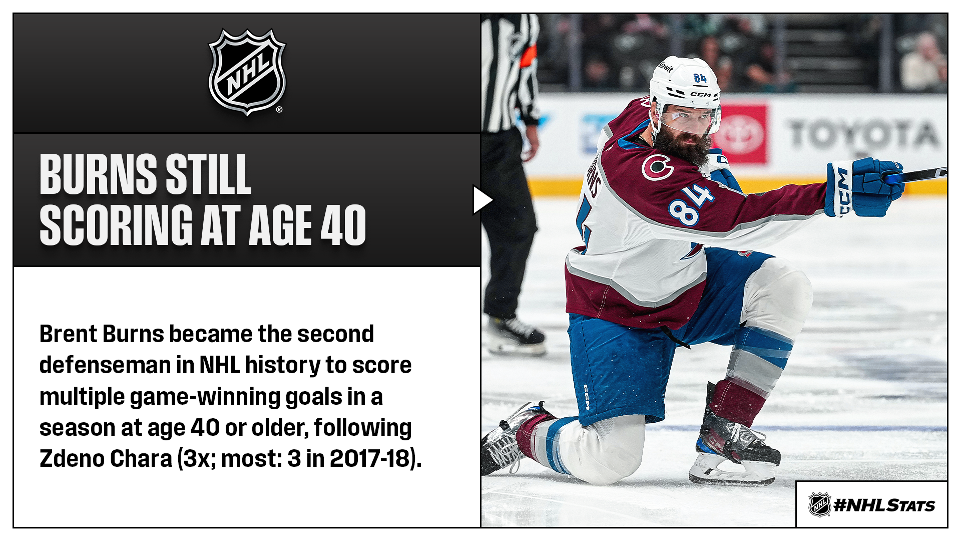 * Burns got the Avalanche on the board just 15 seconds into the contest and recorded the second-fastest game-opening goal by a defenseman in Avalanche/Nordiques history behind Randy Moller (0:09 on Feb. 27, 1988). Burns, who tied Sandis Ozolinsh (5) for the third-most opening-minute goals by a defenseman in NHL history behind Ray Bourque (9) and Larry Murphy (6), notched his 44th career game-winning goal. That total matched Al MacInnis and Denis Potvin for third most by a blueliner in League history.