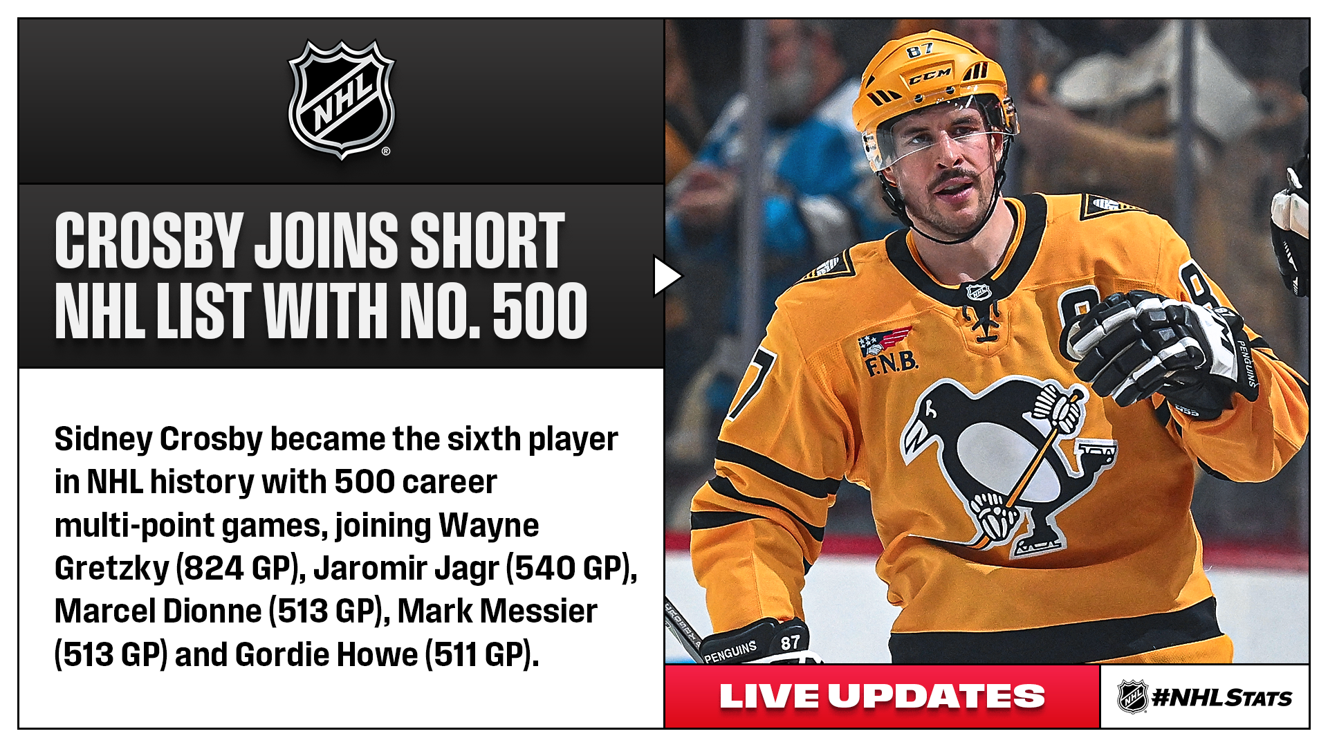Saturday’s edition of #NHLStats: Live Updates featured more notes from all 24 teams in action, including the Penguins, who saw their captain Sidney Crosby (1-1—2) become the sixth player in NHL history with 500 career multi-point games. He became the third-fastest among that group to reach the mark, behind only Wayne Gretzky (738 GP) and Marcel Dionne (1,262 GP).