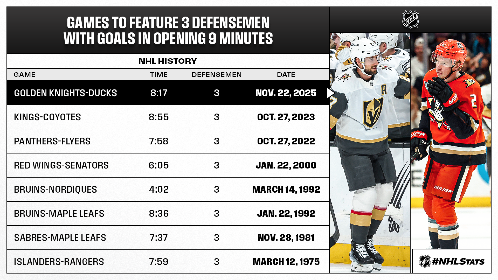 * Golden Knights blueliner Shea Theodore and Ducks defensemen Jackson LaCombe and Olen Zellweger accounted for three goals within the opening nine minutes of play before Troy Terry netted a game-tying tally later in the contest. Cutter Gauthier then scored the game winner with 1:03 remaining in the extra frame to lift Anaheim to its fourth overtime win of the season – tied for the fourth most among all teams; his three career overtime goals are tied with Paul Kariya, Trevor Zegras and Leo Carlsson for the most by a player in Ducks history before age 22.
