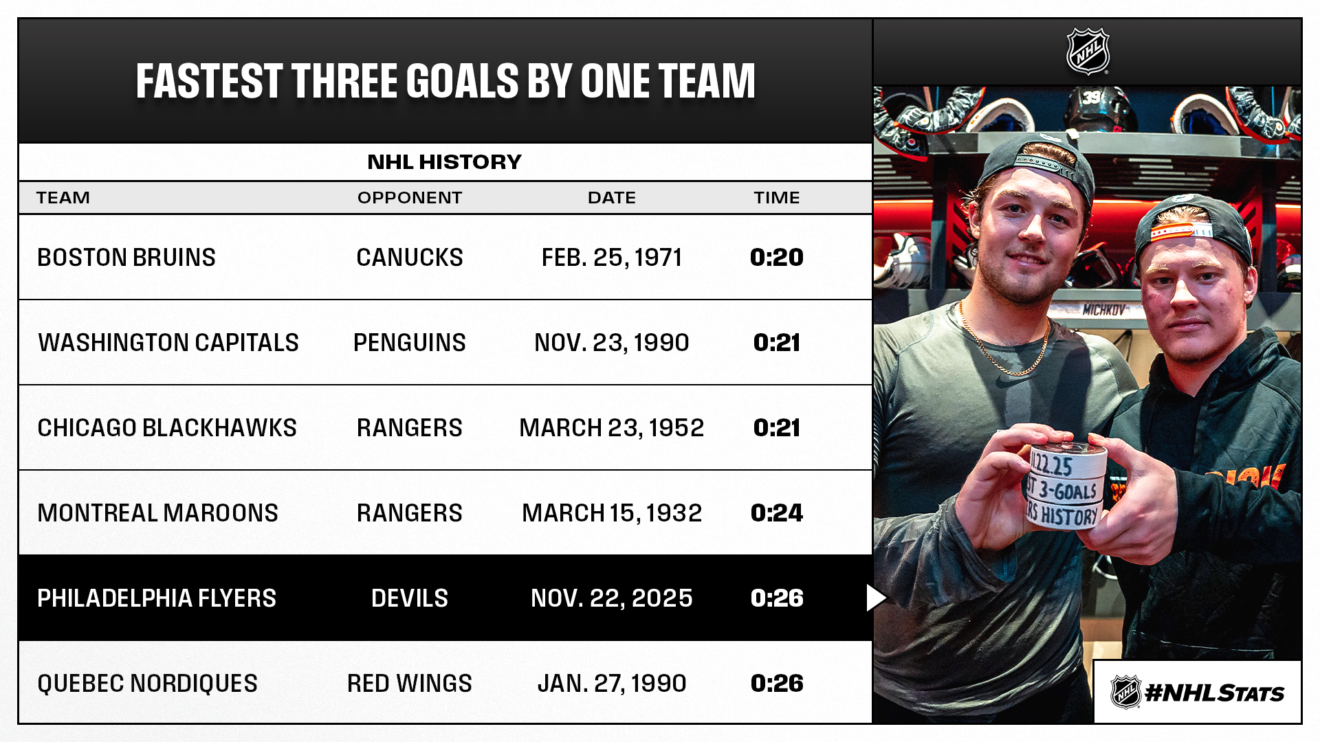 * Foerster’s two goals in 17 seconds were the fourth-fastest two goals by one player in franchise history behind Ron Flockhart (0:08 on Dec. 6, 1981), Jeff Carter (0:13 on Jan. 8, 2008) and Ron Sutter (0:15 on Feb. 17, 1986).