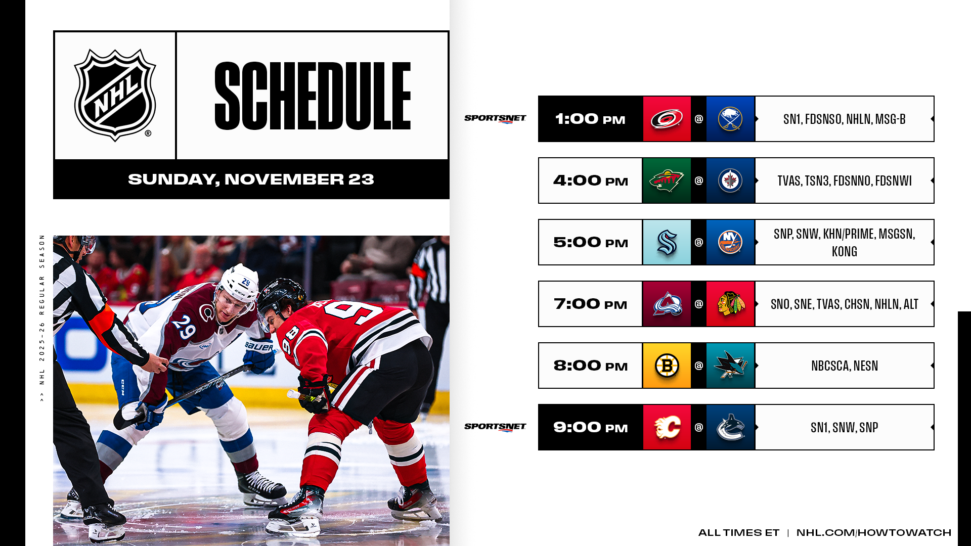 * Four of the top 15 scorers in the NHL will share the same ice Sunday on Sportsnet (SNO & SNE), NHL Network and TVA Sports when the Avalanche (Nathan MacKinnon, Martin Necas & Cale Makar) visit the Blackhawks (Connor Bedard). MacKinnon (5-7—12) and the Avalanche (5-3-0) have had the upper hand on Bedard (1-4—5) and the Blackhawks (3-4-1) across the previous eight meetings between the No. 1 picks.