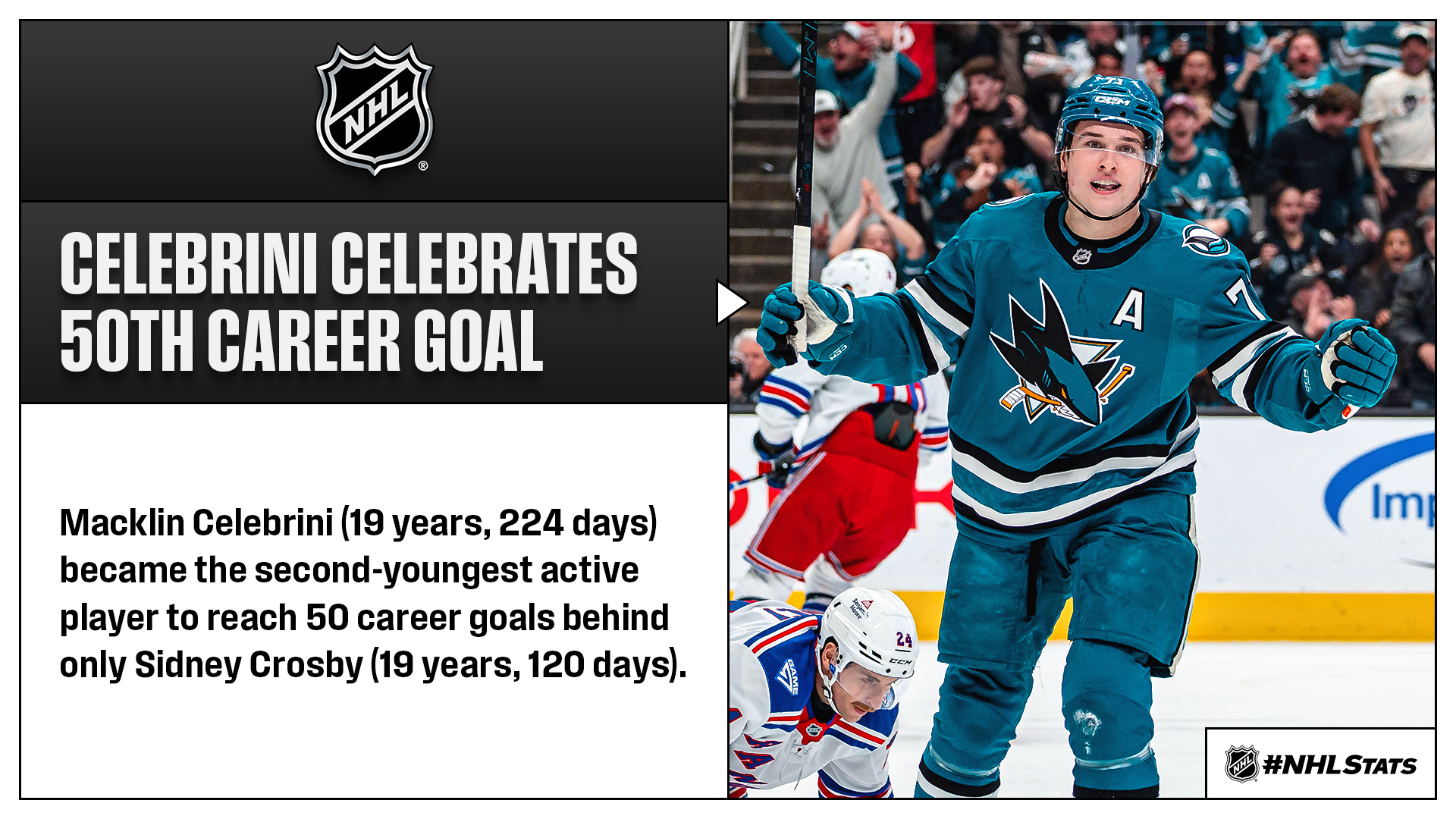 * Macklin Celebrini reached the 50-goal plateau in his career during San Jose’s win and achieved notable franchise and League-wide feats while doing so.