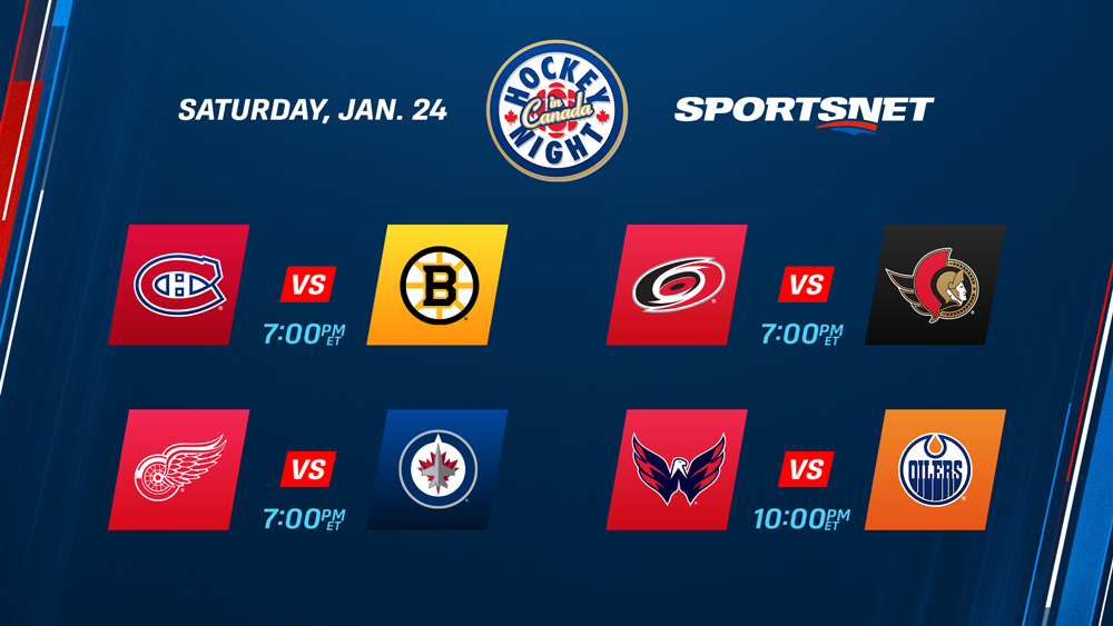 Nearly half of Saturday’s nine-game slate will be featured as part of Hockey Night in Canada’s four-game broadcast on Sportsnet, which includes a pivotal Atlantic Division showdown between Original Six rivals, Connor McDavid continuing the pursuit of his sixth Art Ross Trophy while facing future Team Canada teammate Tom Wilson, Brady Tkachuk looking to extend his point streak to a season-high six games and the Jets looking to build on recent success (5-1-2 in last 8 GP) while hosting the Red Wings.