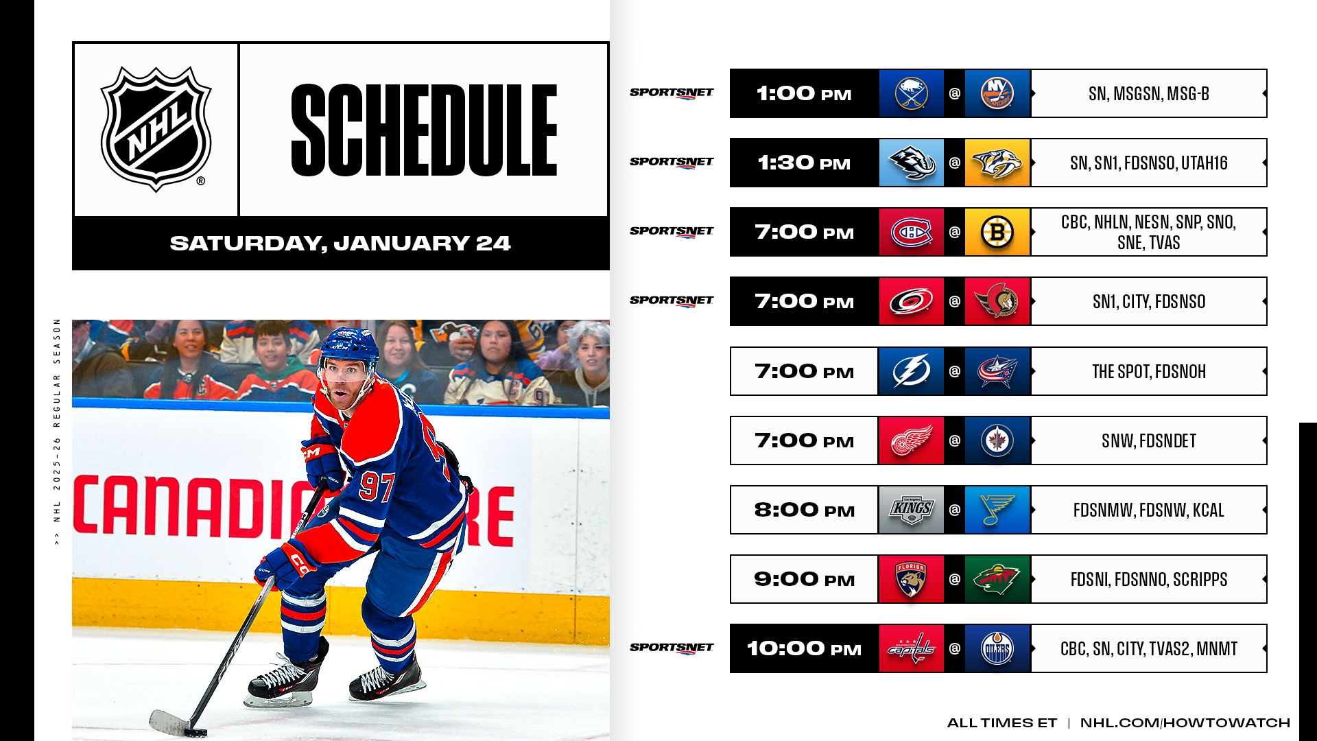 * A nine-game Saturday will feature nearly half of its contests on Hockey Night in Canada, with one of those featuring Connor McDavid continuing the pursuit of his sixth Art Ross Trophy while facing future Team Canada teammate Tom Wilson.