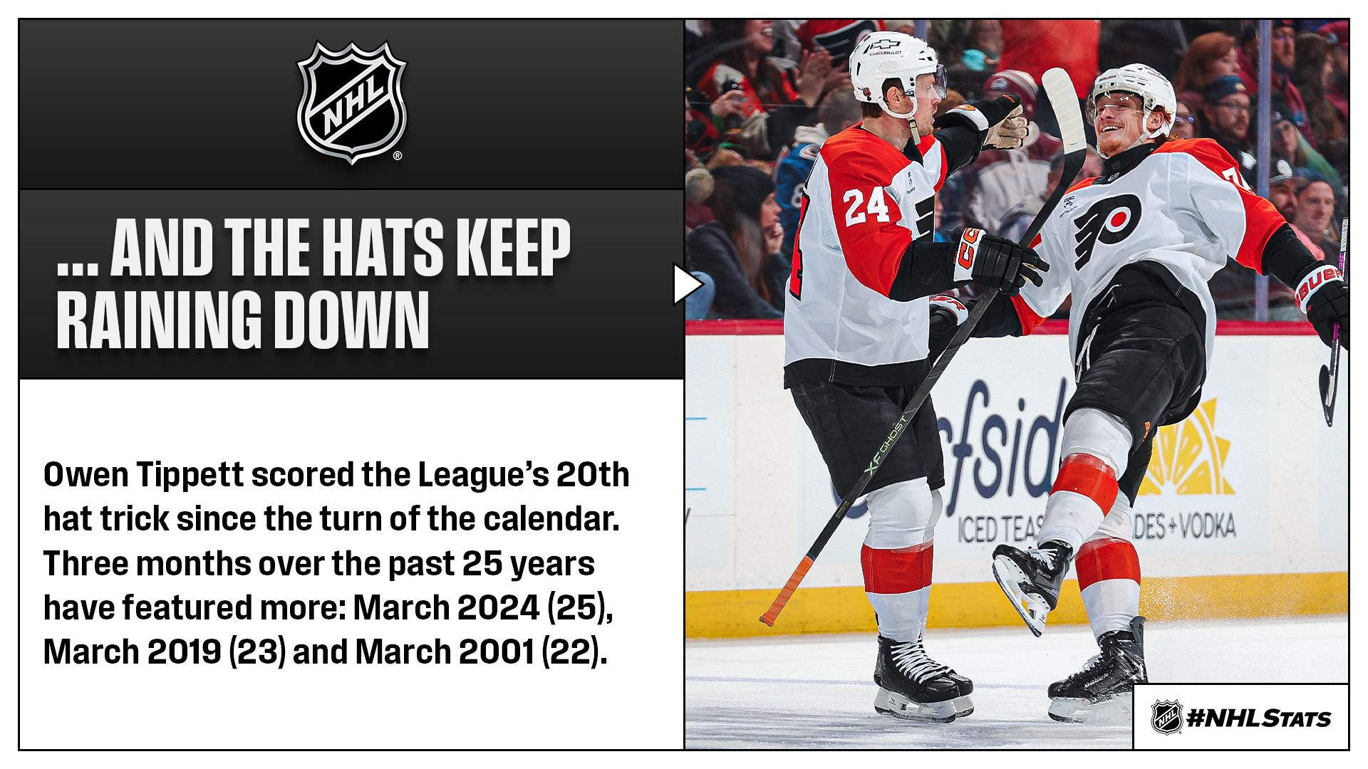Owen Tippett recorded his second career hat trick and third four-point game, while Matvei Michkov tallied 2-1—3 to help the Flyers (24-17-9, 57 points) score seven against the League-leading Avalanche (34-6-9, 77 points) – who have the fewest goals allowed across the NHL – and move within three points of a Wild Card spot.