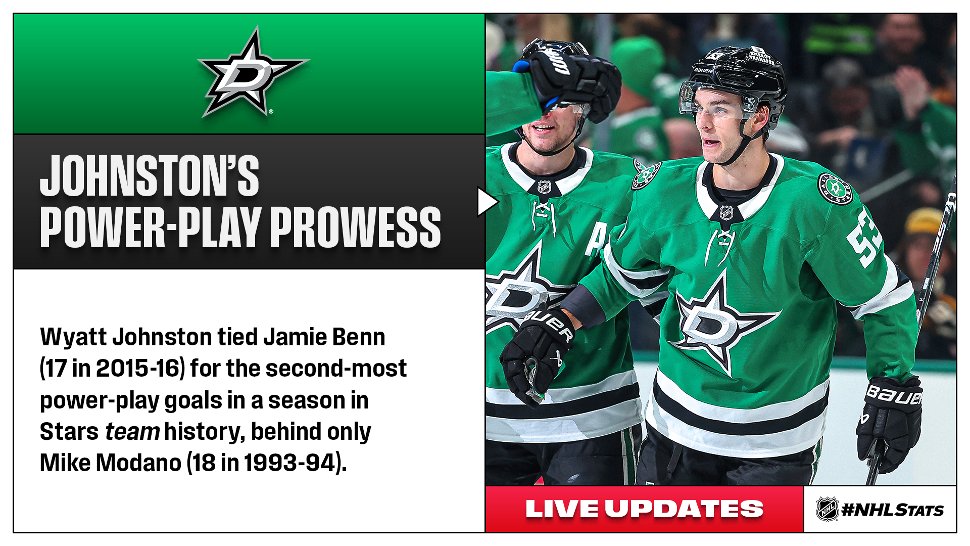 * Dallas saw Jason Robertson become the League’s third 30-goal scorer this season and Wyatt Johnston tally his League-leading 17th power-play marker of 2025-26. Johnston’s 28 power-play goals dating to 2024-25 passed Leon Draisaitl (27) for the most through that span.