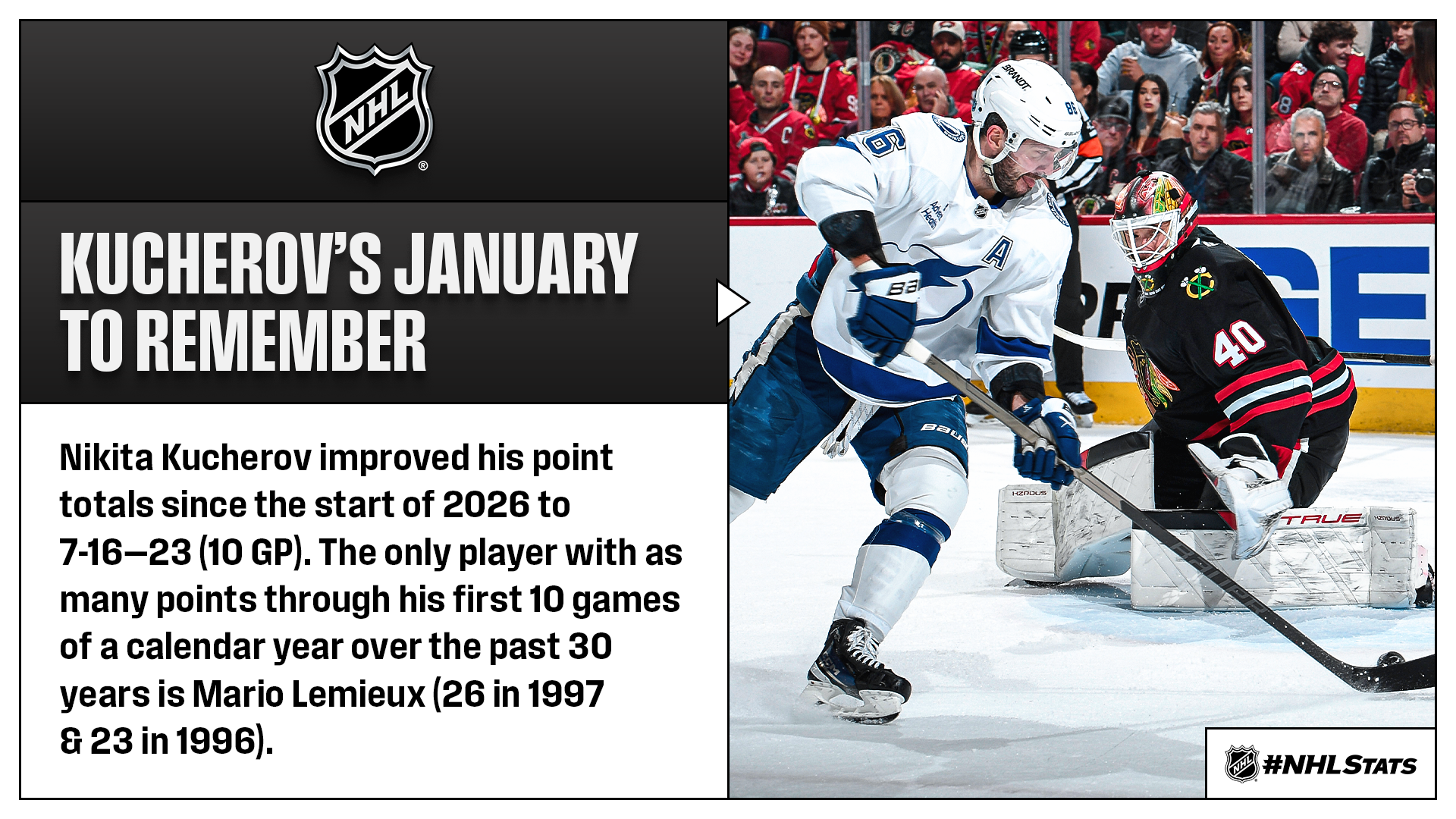 * Kucherov tallied his League-leading 23rd point of 2026 and helped the Lightning extend their point streak to 15 games (14-0-1) – the third-longest run in franchise history. Tampa Bay (32-13-4, 68 points) overtook idle Detroit (31-16-5, 67 points) for first place in the Atlantic Division with its third straight win and is just eight days away from facing off against Boston at the 2026 Navy Federal Credit Union NHL Stadium Series. Click here for the #NHLStats Pack.