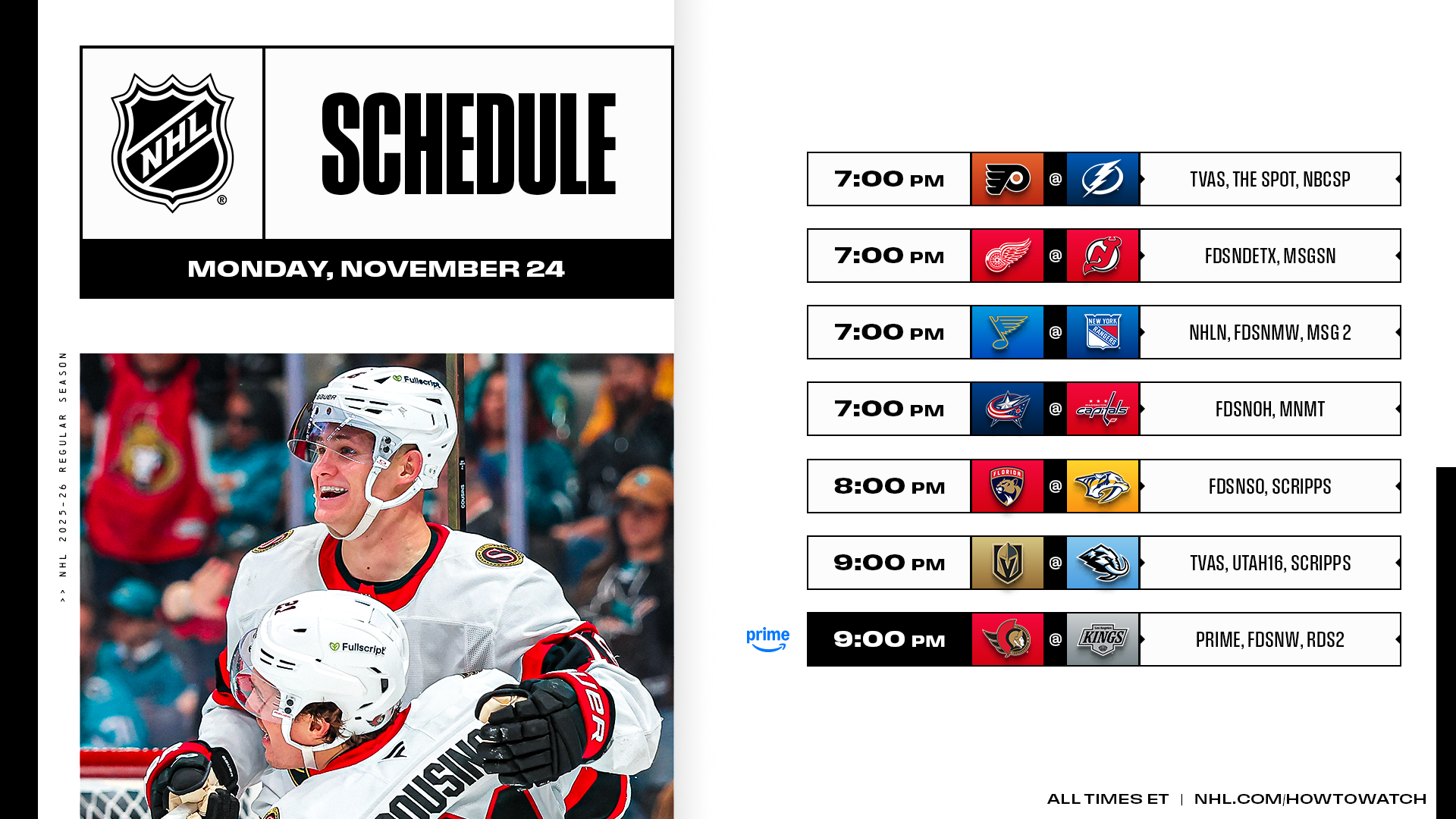 * Anze Kopitar and the Kings clash with Tim Stützle and the Senators on Prime Monday Night Hockey to cap off a seven-game slate.