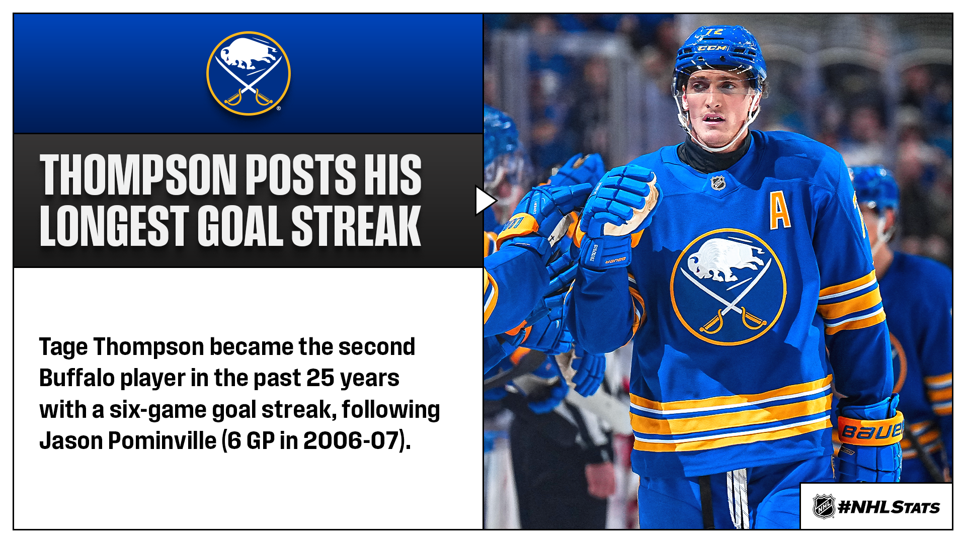 * Thompson capped the victory with an empty netter and extended his goal streak to a career-best six games – tied with Jason Robertson (active) and Morgan Geekie for the longest this season.
