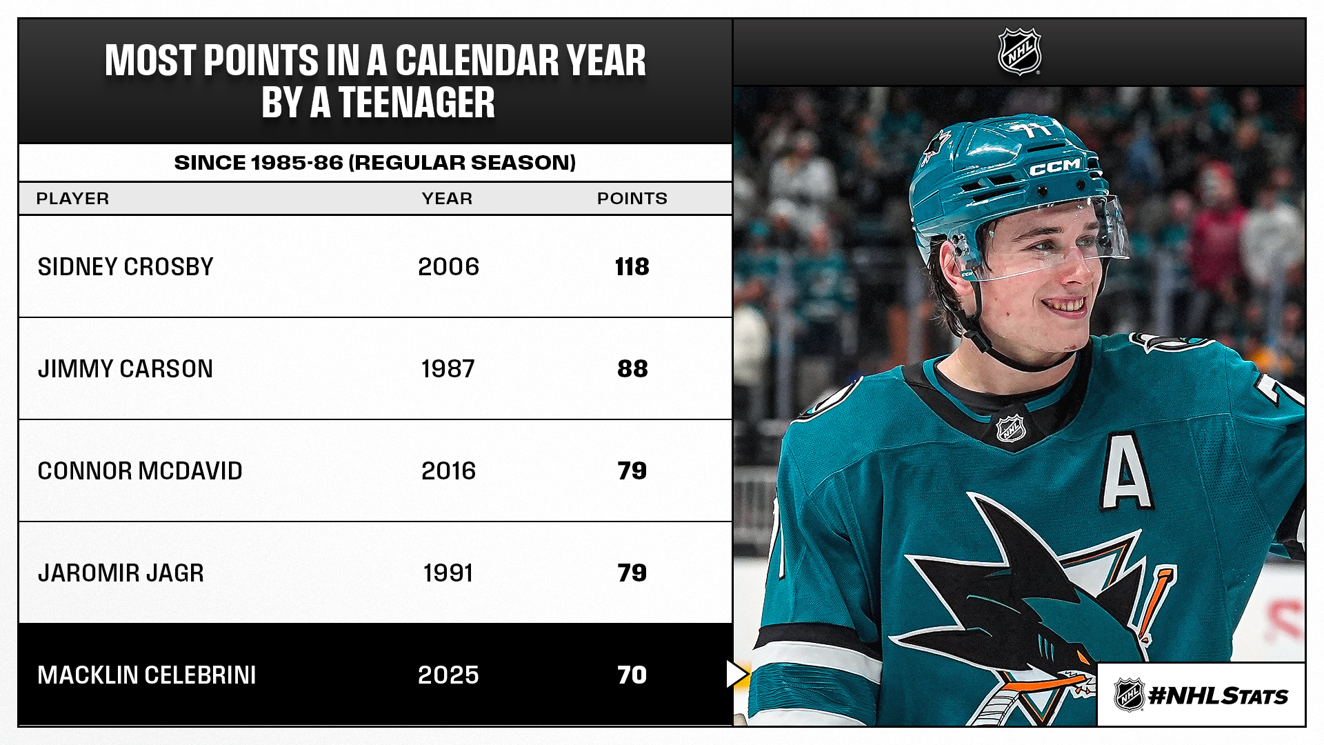 * Macklin Celebrini put up a multi-point performance and became the fifth teenager in the past 40 years to record 70 or more points in a calendar year.