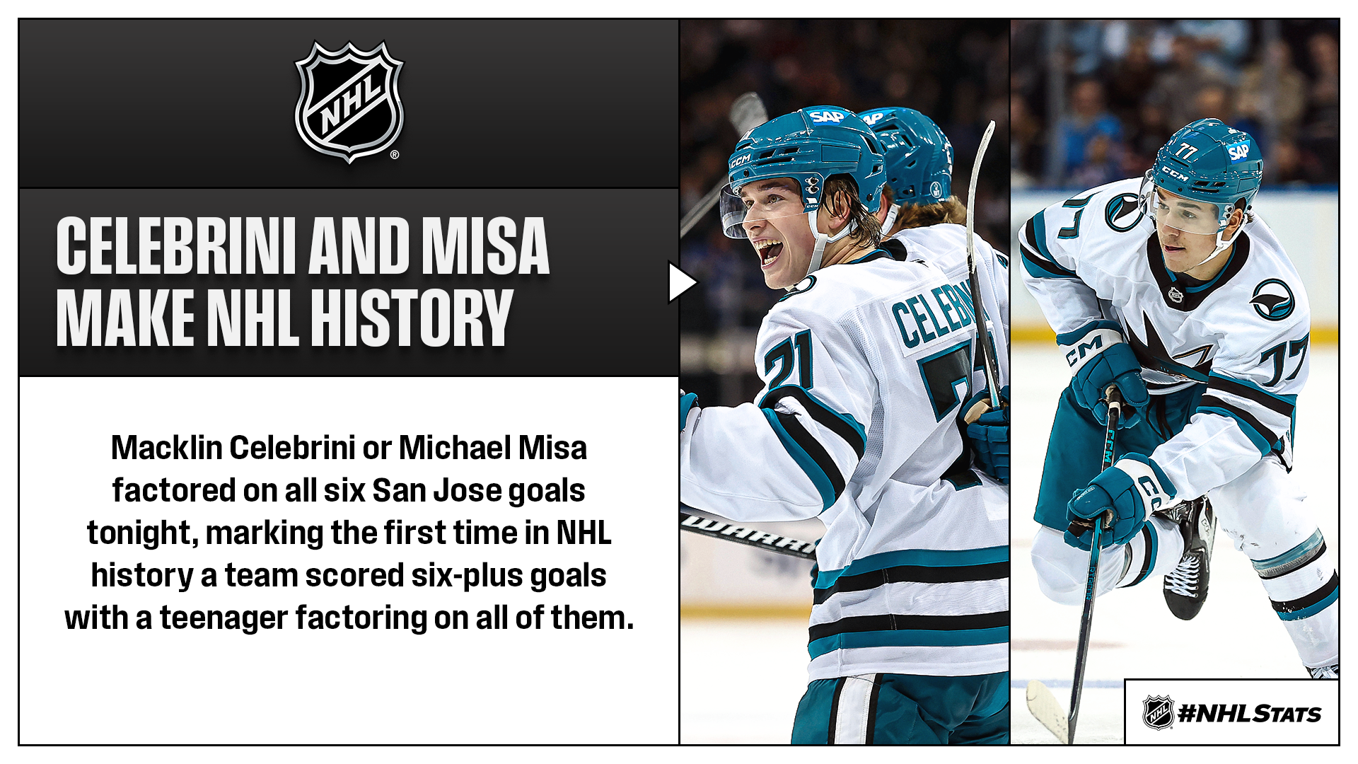 * Every goal scored by the Sharks on Thursday had a teenager involved in the scoring, with Celebrini (age 19) and Michael Misa (age 18) combining for that feat. Dating to Oct. 21, San Jose has had eight straight goals with a teenager notching a point – the longest such stretch since 2017-18 when the Jets also did so (Laine had a point on 8 straight from March 2-8, 2018).