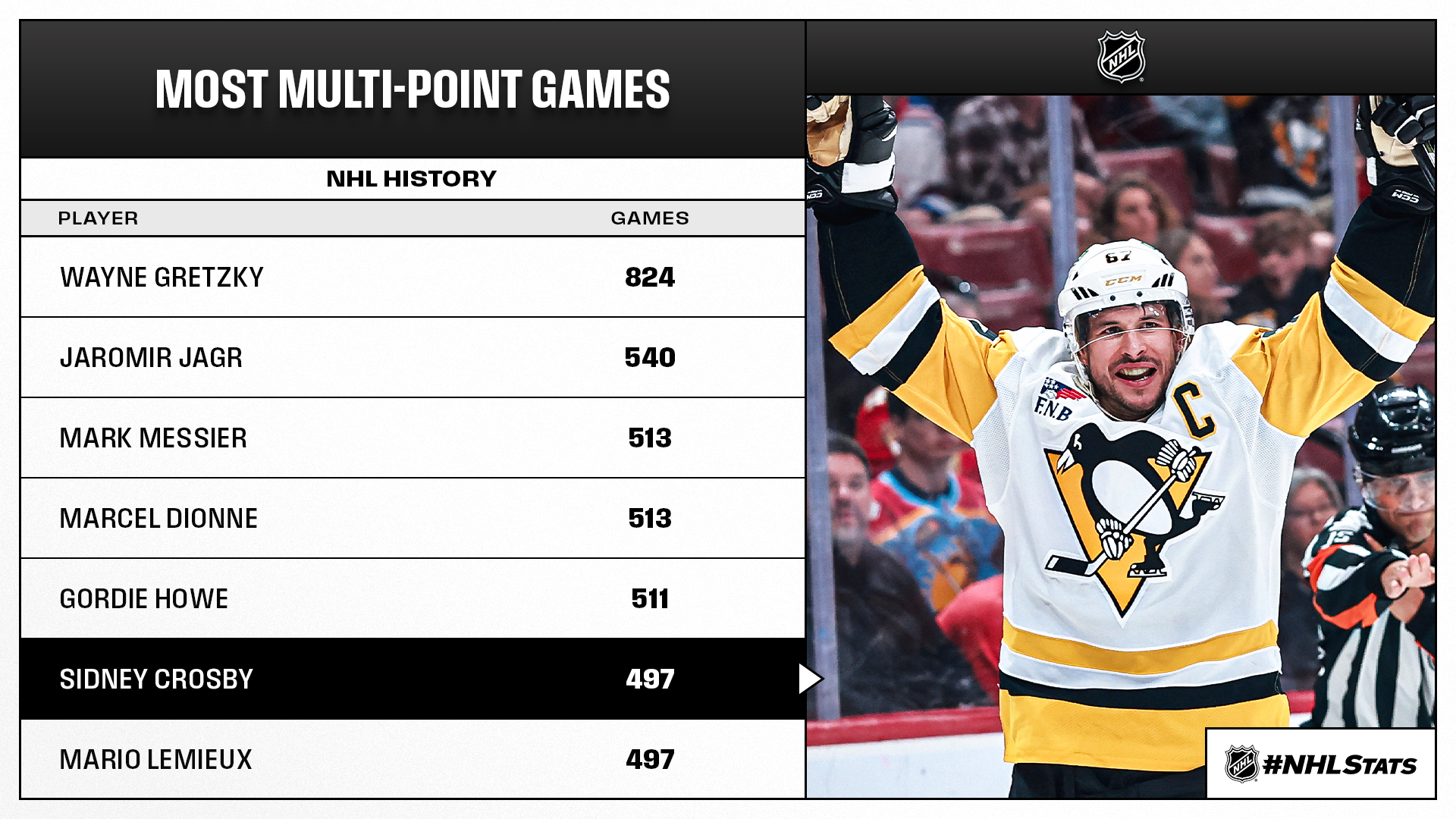 Sidney Crosby (2-1—3) and Evgeni Malkin (0-2—2) combined on a pair of goals and helped the Penguins skate to a fourth straight win with a victory against the defending Stanley Cup champion Panthers. Crosby recorded his 497th career multi-point game to tie Penguins legend and former teammate Mario Lemieux for the sixth most in NHL history. Crosby now sits two points shy of becoming the ninth player in NHL history with 1,700 career points.
