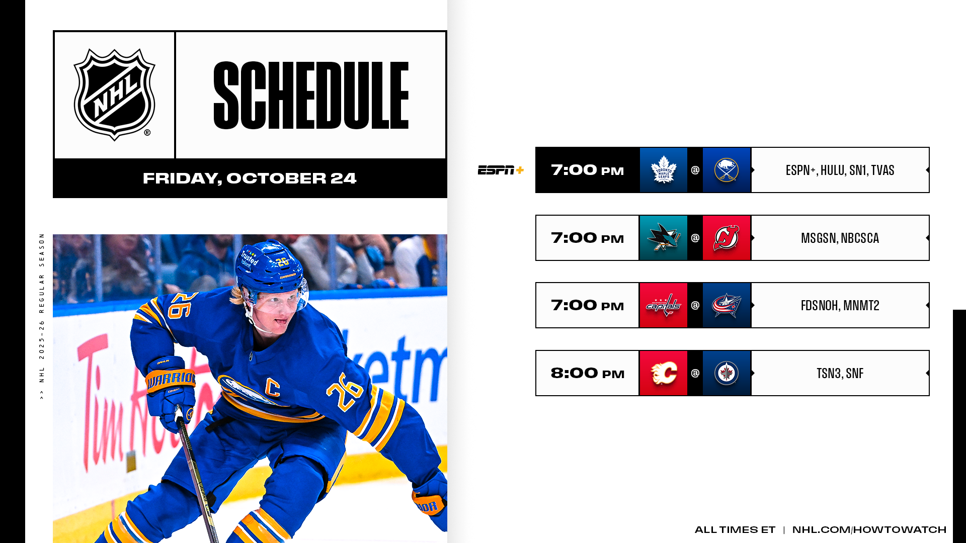 * The Devils will put their six-game winning streak on the line during Friday’s four-game slate, which begins with the Maple Leafs facing the Sabres on ESPN+.