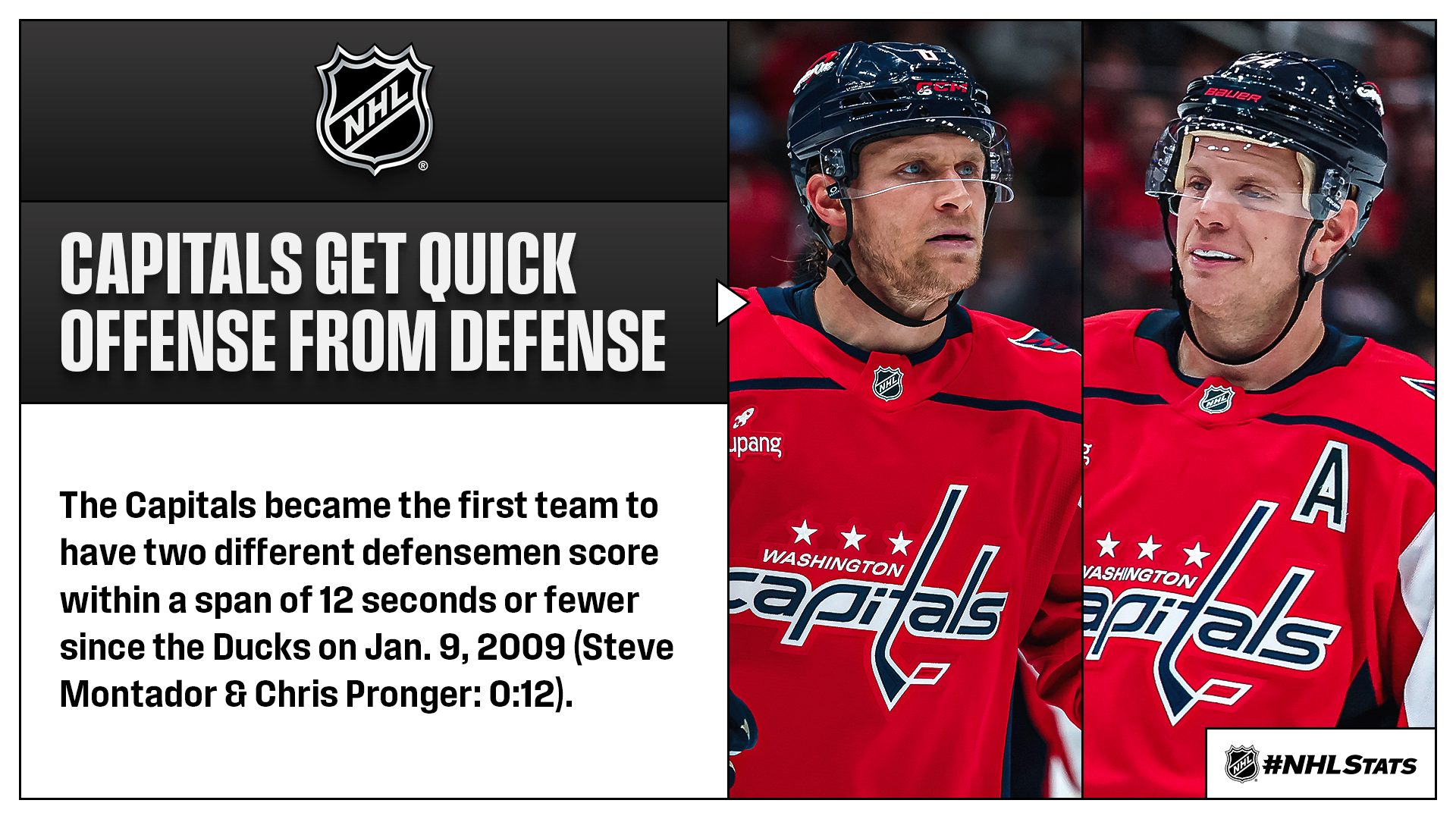 * Jakob Chychrun (2-0—2) and John Carlson (1-1—2) both found the back of the net Monday, including scoring 12 seconds apart in the second period to set a franchise mark for the fastest two goals in a game by defensemen, as the Capitals defeated the Blue Jackets at Capital One Arena.