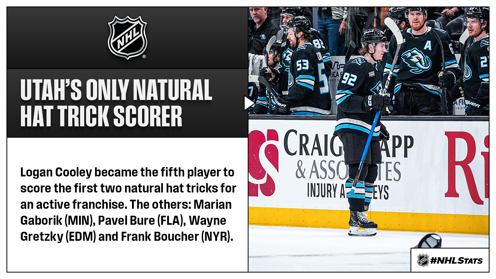 Logan Cooley had a night to remember: he recorded his first five-point outing, posted the first four-goal game in Mammoth history and achieved a rare feat with his second natural hat trick of the season.