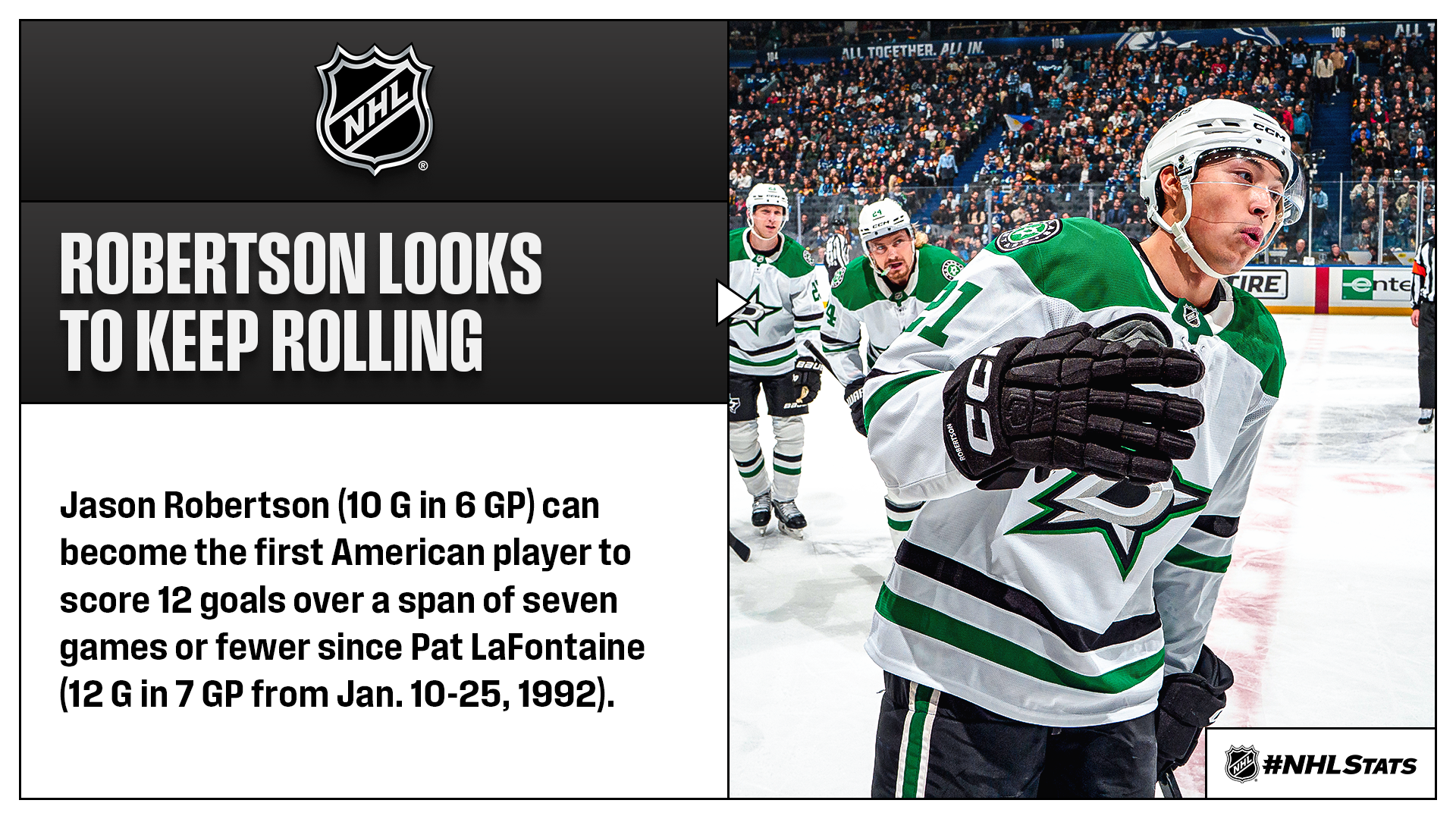 * Robertson can become the 13th different American player in NHL history to post a seven-game goal streak and third in as many seasons (Jake Guentzel: 7 GP in 2024-25 & Auston Matthews: 8 GP in 2023-24). Only three have surpassed seven games: Pat LaFontaine (11 GP in 1989-90), Brett Hull (10 GP in 1991-92 & 1990-91) and Matthews.