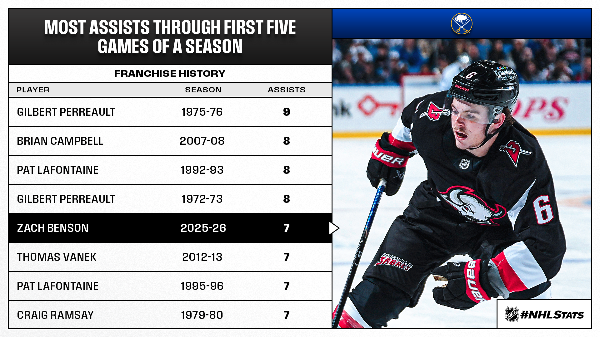 * Benson (0-7—7 in 5 GP) collected his team-leading seventh assist on one of five Sabres goals as Buffalo took the first game of a back-to-back, home-and-home set with Toronto. The Sabres extended their home winning streak to four games, matching the Mammoth and Red Wings for the longest run by a team this season; they have outscored opponents 20-9 during that span.